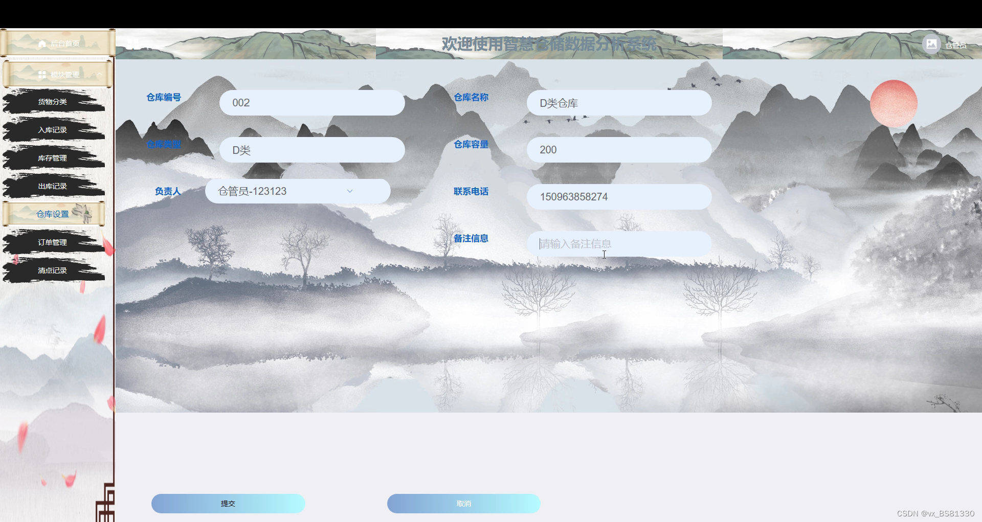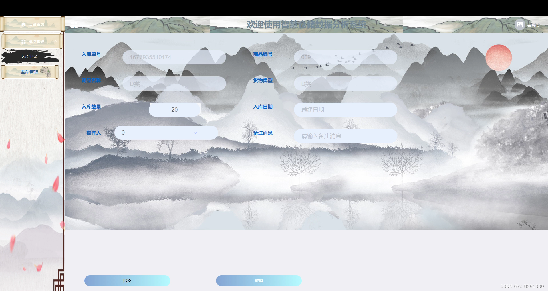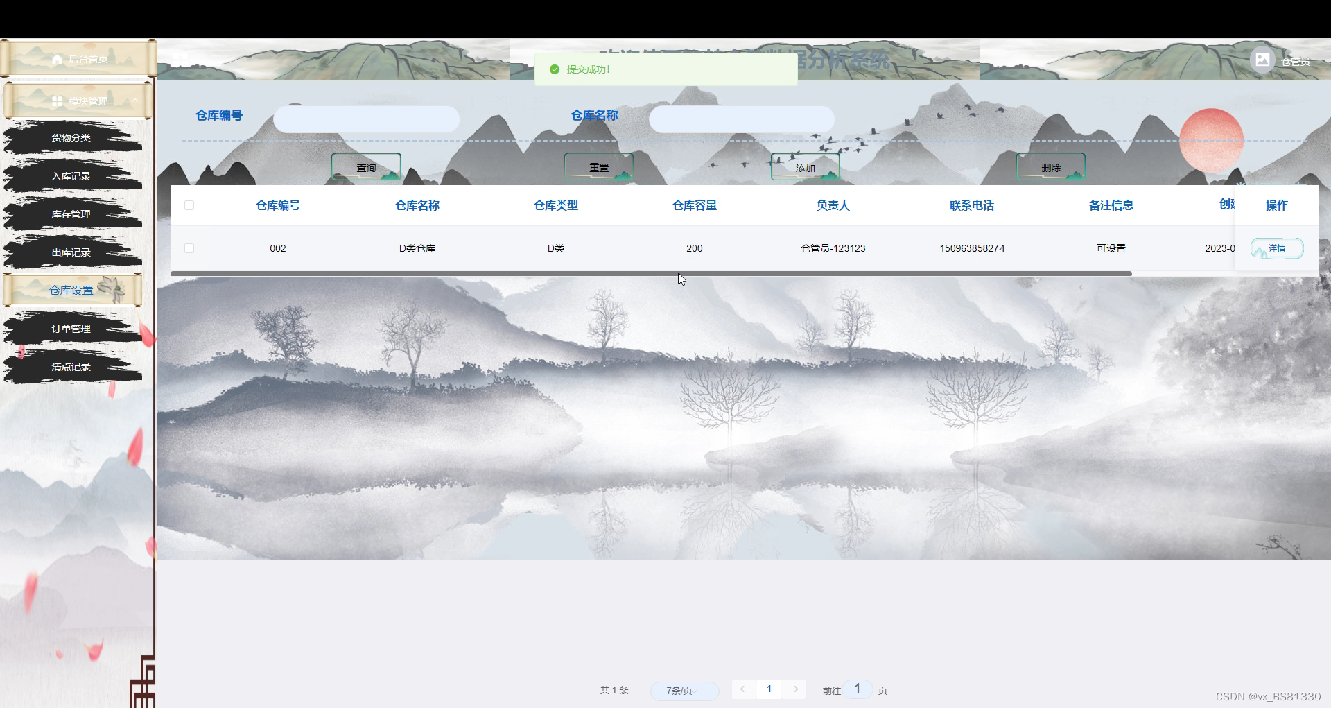 | 进入仓库管理界面,点击“录入”按钮,填写所有必填项,点击提交 | 提示“录入成功”,并返回查询界面 | 一致 | |