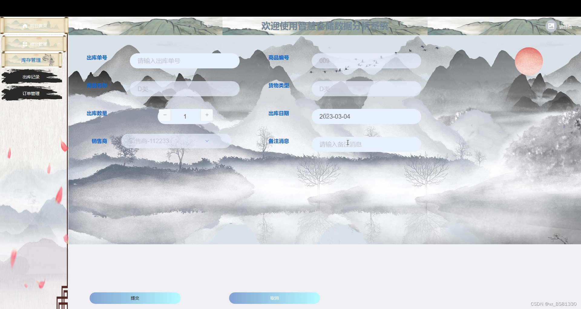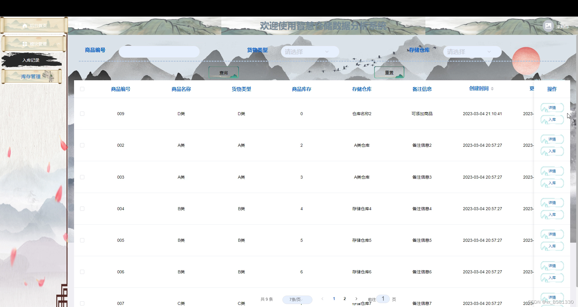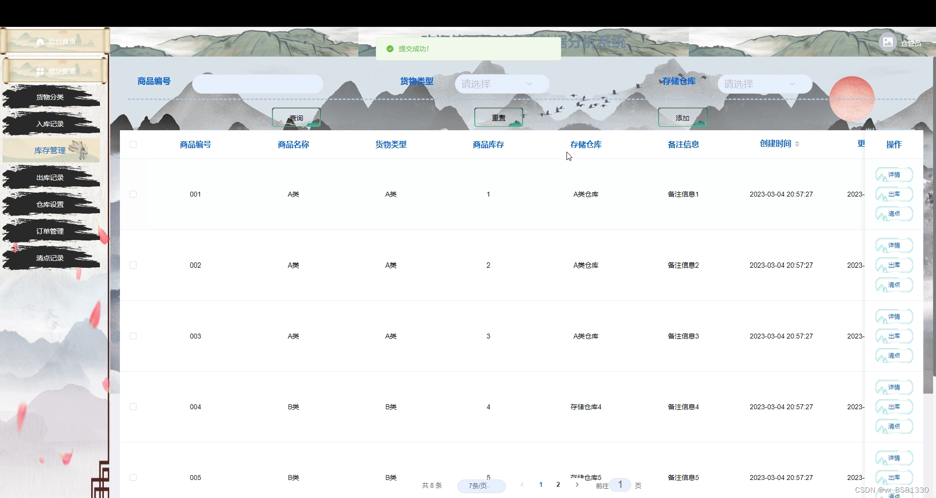 | 进入仓库管理界面,点击“录入”按钮,填写所有必填项,点击提交 | 提示“录入成功”,并返回查询界面 | 一致 | |