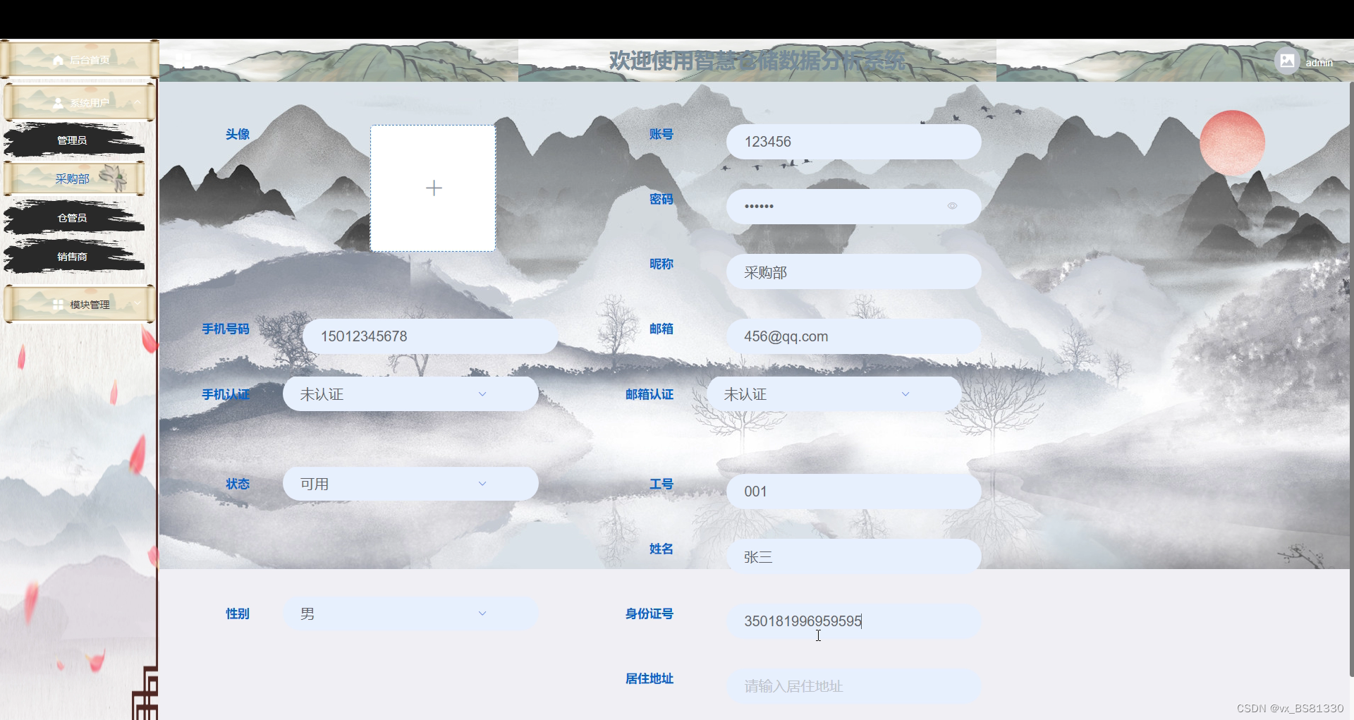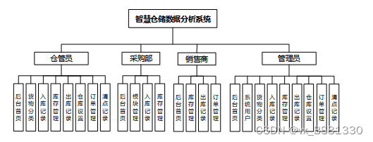 智慧仓储数据分析系统在对需求做解析后,整个系统主要分为两个部分:管理员和仓管员、采购部、销售商,每个模块下的分支功能不一样。对功能做出如下说明:
