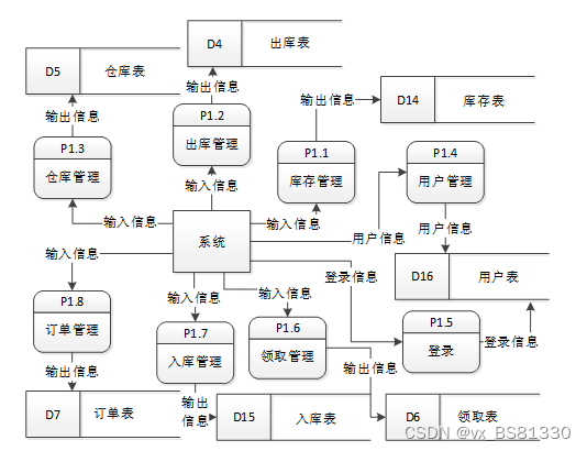 二层数据流程是对一层数据流层图中填写登录信息、用户功能的细化。即:货物分类,入库记录,库存管理,出库记录,仓库设置,订单管理,清点记录查询等操作。
