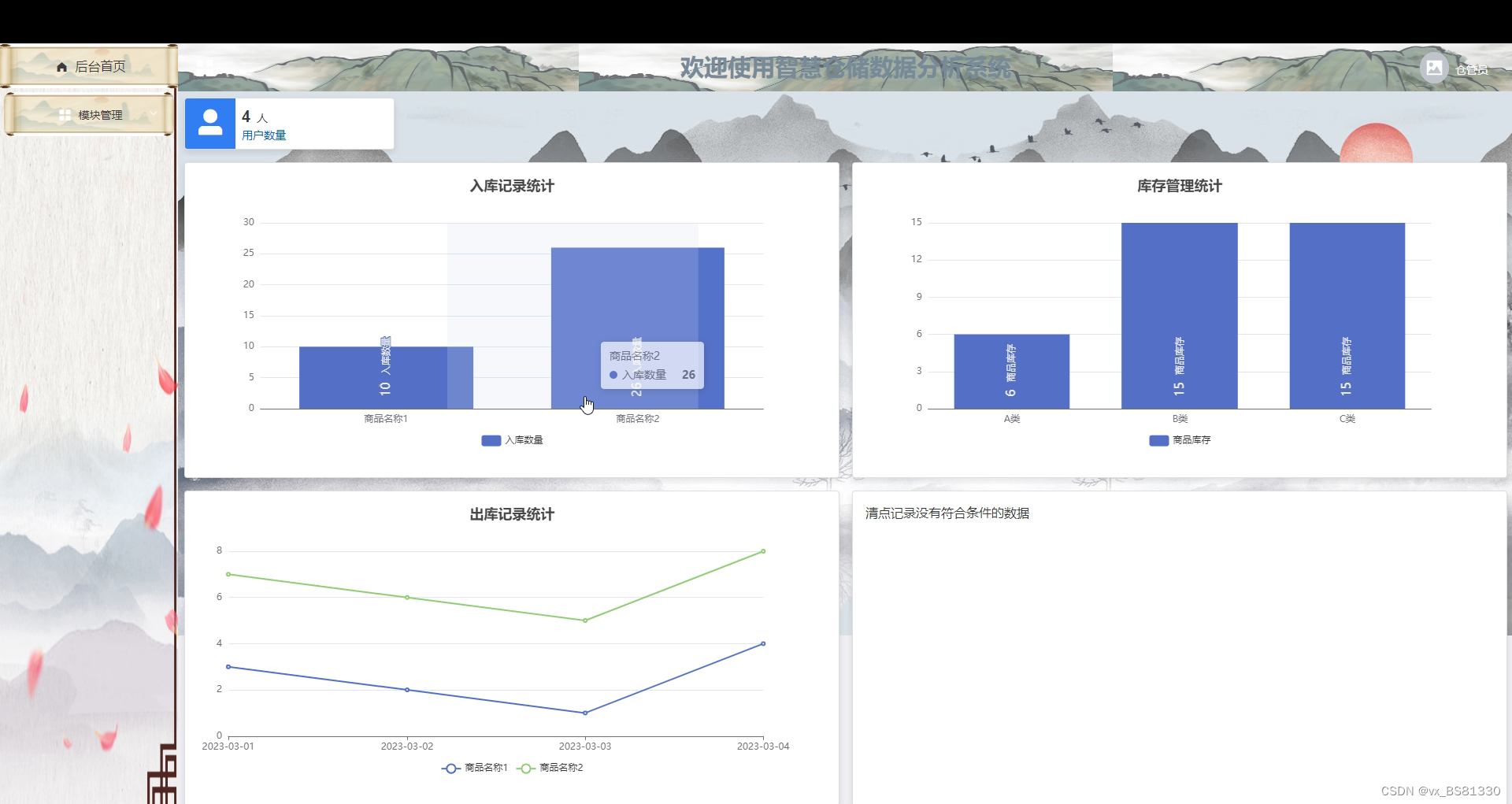通过智慧仓储数据分析系统的开发,本人巩固了之前学过的知识,如今将平时所学到的知识融合在设计中,在设计过程中,做了很多的准备,首先,在数据库系统的设计过程中,尤其是在数据库的工作原理、工作特点,对其深刻的讨论,与此同时,对于小型站点来说,最好服务器的选择,其次,利用所学的知识点分析所做的系统,并在此基础上设计。