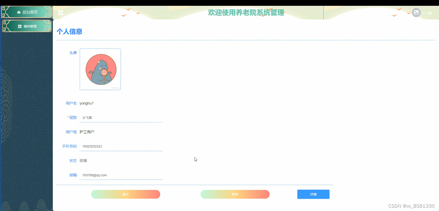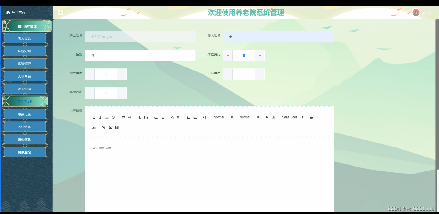 This design mainly realizes a nursing home system integrating the advantages of humanization, efficiency and convenience, and completes functional modules such as elderly information, salary management, asset management, personnel attendance, elderly management, expense management, accident record, bed type, occupancy information, leave information, health monitoring, asset type, etc. The system communicates with the server through the browser to realize data interaction and change. You can operate the system by moving your fingers through a computer to realize data communication management. The design process of the whole system fully considers the safety, stability and reliability of data, and the operation process is simple. The system improves work efficiency and reduces errors and omissions in data storage through scientific management and convenient services.