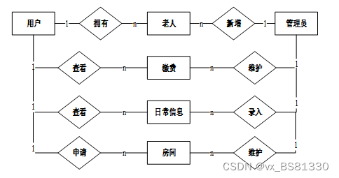 对于一个要开发的系统来说,E-R图可以让别人能更快更轻松的了解此系统的事务及它们之间的关系。根据系统分析阶段所得出的结论确定了在养老院系统中存在着多个实体分别是用普通用户、管理员、老人、账单、护工用户、工资、请假、留言。