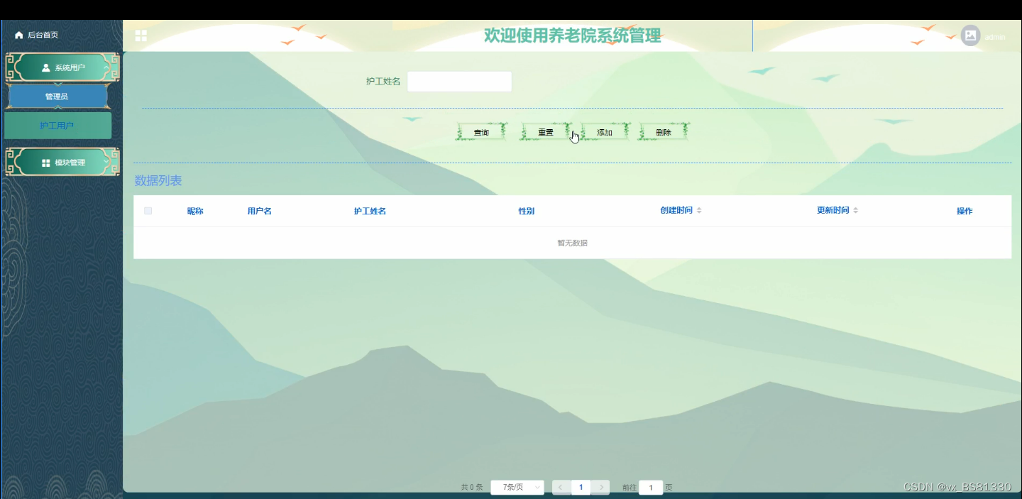 查找护工用户时,输入需要查找的护工用户名,调用getData方法获取所有数据并且进行分页,把获取到的所有数据显示到视图上,这时候只需要用脚本方法便能快速查找,不涉及对数据库操作。