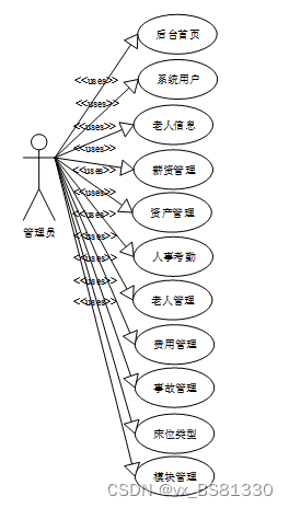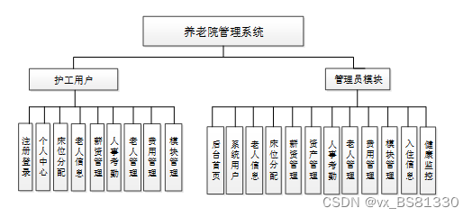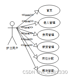 系统设计的目的是分析系统包括的所有功能结构,为开发人员设计开发和实现系统做好准备工作。经过前期的需求调查、分析和整理之后,确定的总体需求主要包括多个模块,分别是:房间信息、床位申请、分配管理、上报管理、日常记录、缴费信。系统整体角色分为两个部分,一是护工用户、二是管理员。权限分布也是很明显,游客即是无需任何验证便可浏览相关信息;护工用户是在除去浏览信息之外还具有查询和管理自己账户信息、个人资料修改、护工用户注册查看、床位分配、薪资管理、人事考勤、老人管理、费用管理、事故记录、入住信息、请假信息、健康管理操作等权限;管理员是最高权限拥有者。