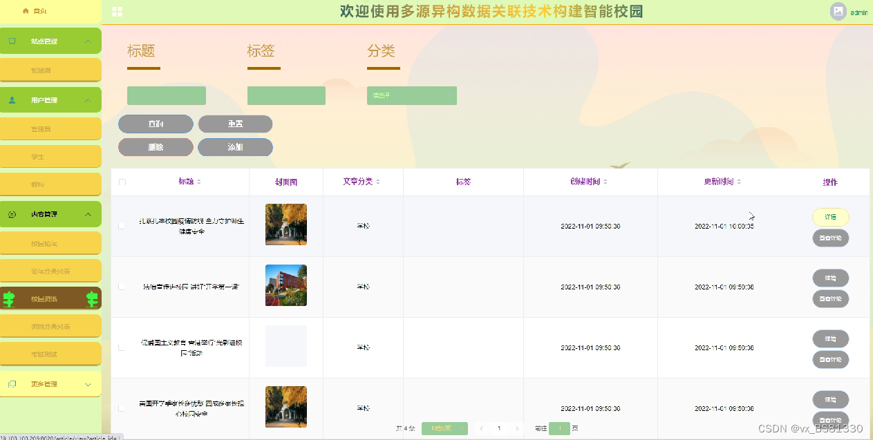 校园资讯管理,在此管理页面可以校园资讯进行增删改等操作,如图5-5所示。
