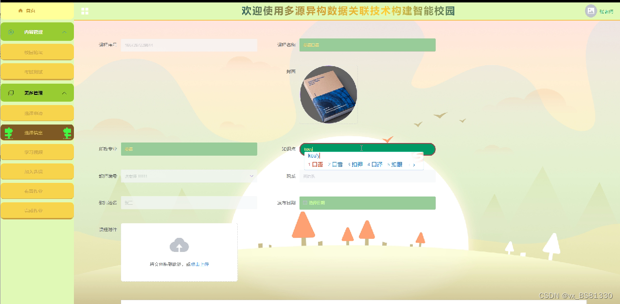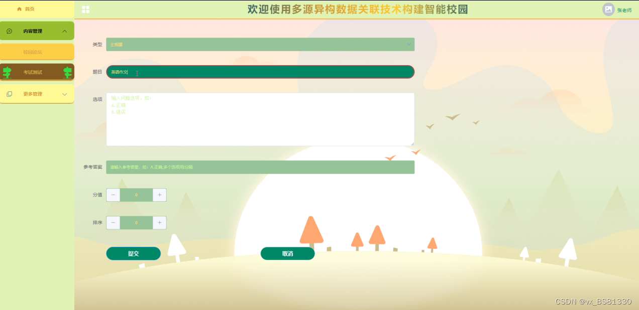 (1)功能要求:可以管理首页,站点管理,用户管理(管理员,教师,学生),内容管理(校园论坛,论坛分类列表,校园资讯,资讯分类列表,考试测试),更多管理(选课申请,选课信息,学习视频,加入选课,布置作业,完成作业,院系,专业)等功能模块。