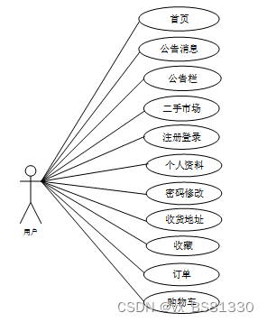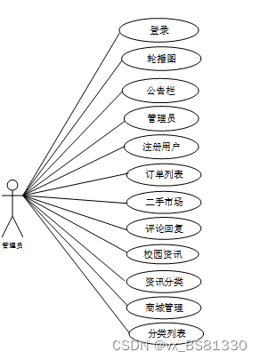 通过2.3功能的分析,得出了本校园二手市场交易系统的用例图: