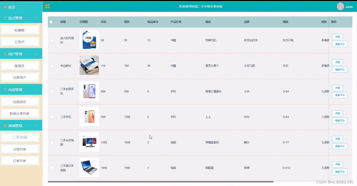 (2)商城管理:管理员可以对校园二手市场交易系统中现有的商品进行增删改查。