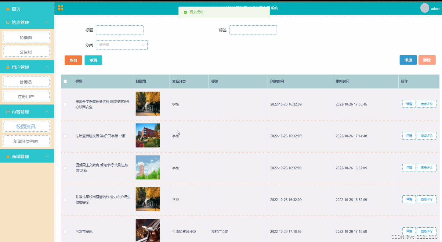 (2)校园资讯管理:管理员在后台可以对校园二手市场交易系统中显示的校园资讯信息进行增删改查。