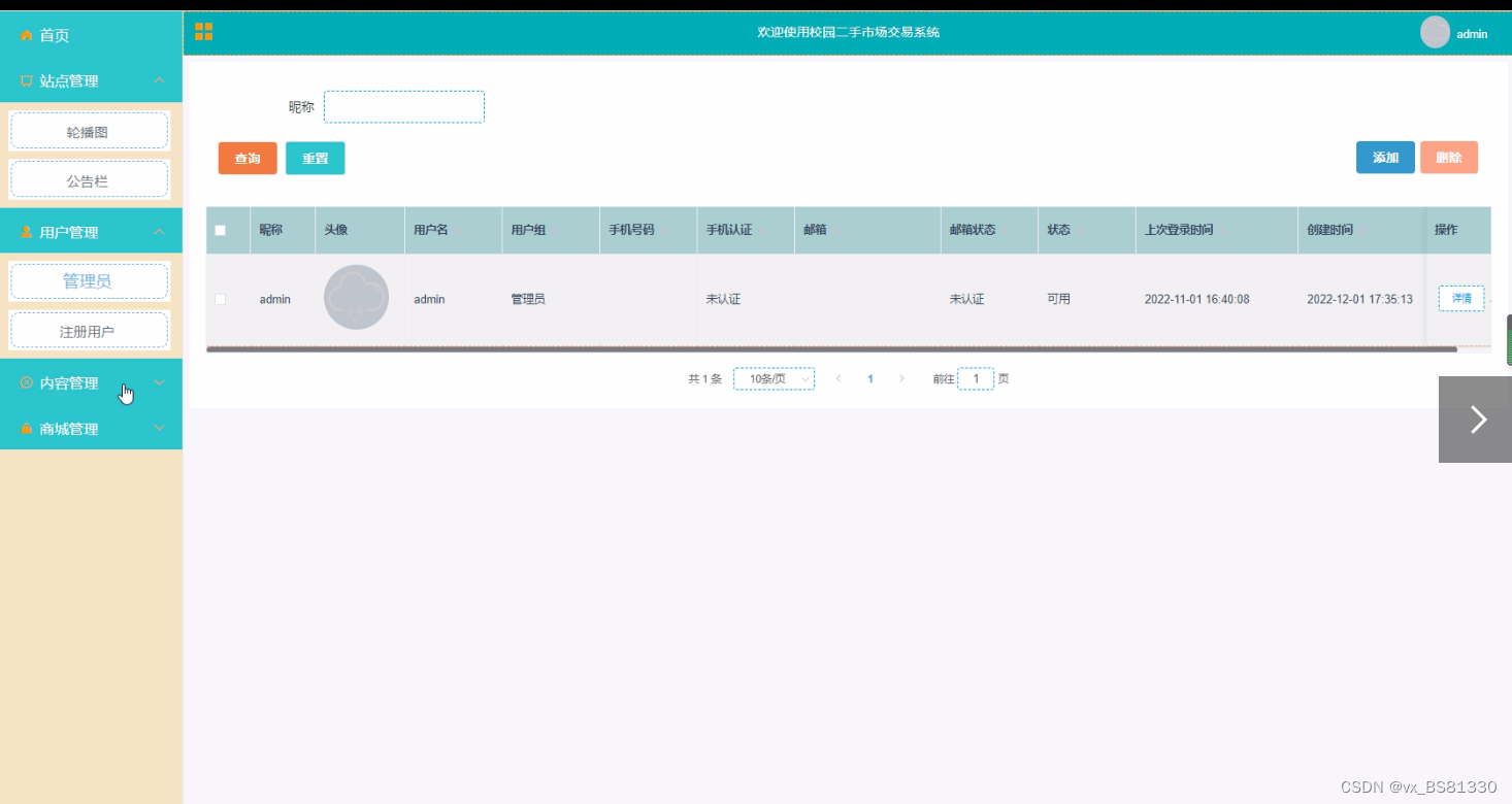 校园二手市场交易系统中的管理人员是可以对前台注册的买家进行管理的,也可以对管理员进行管控。界面如下图4-8所示。