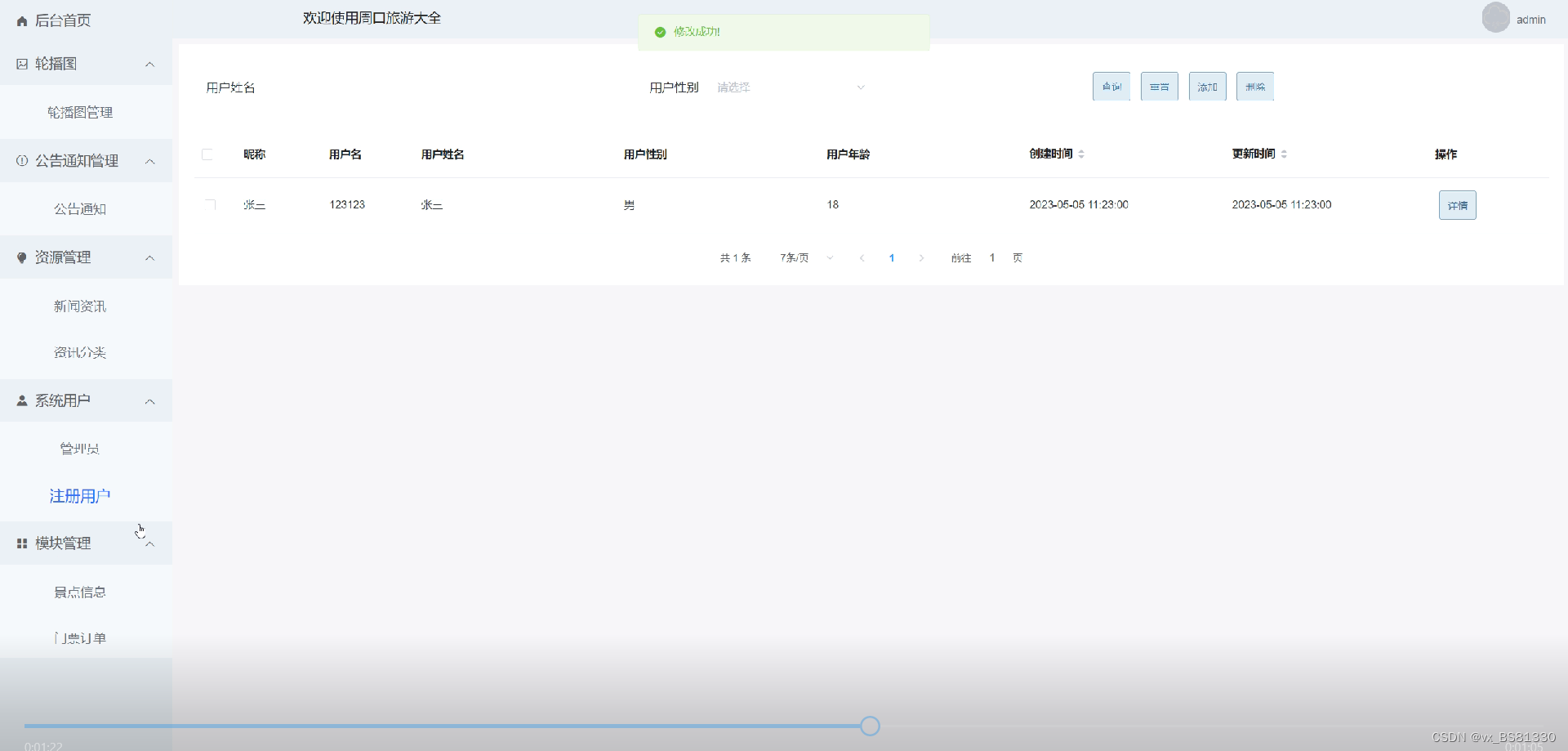 (2)系统用户管理:管理员可以对周口旅游大全微信小程序中的管理员及普通用户进行增删改查。