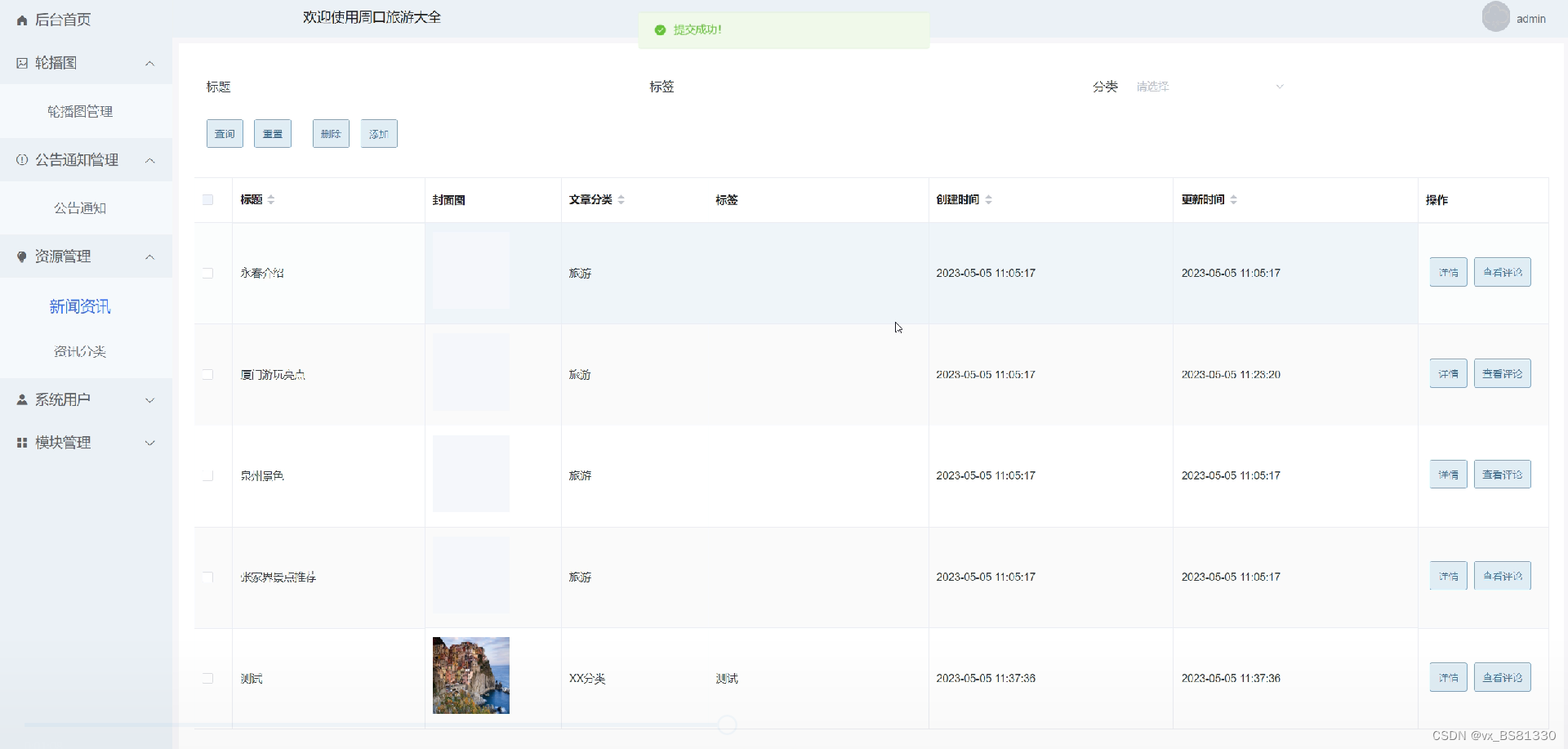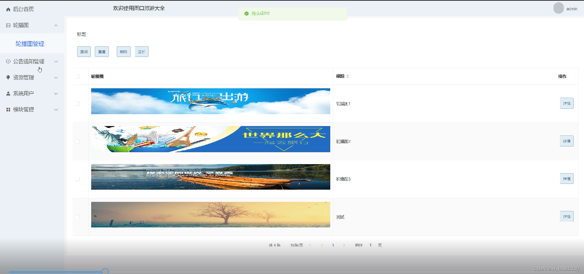 - 轮播图与通知公告管理:管理员可以对系统前台展示的轮播图以及公告进行增删改查,方便用户进行查看。