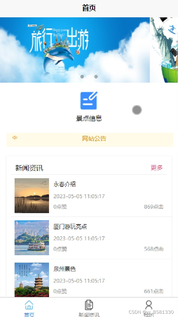 (2)查看周口旅游大全微信小程序的首页信息:周口旅游大全微信小程序的首页信息包含了首页、公告通知、新闻资讯、景点信息等。