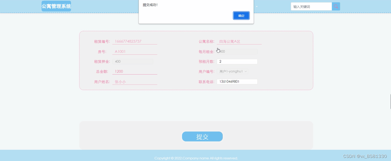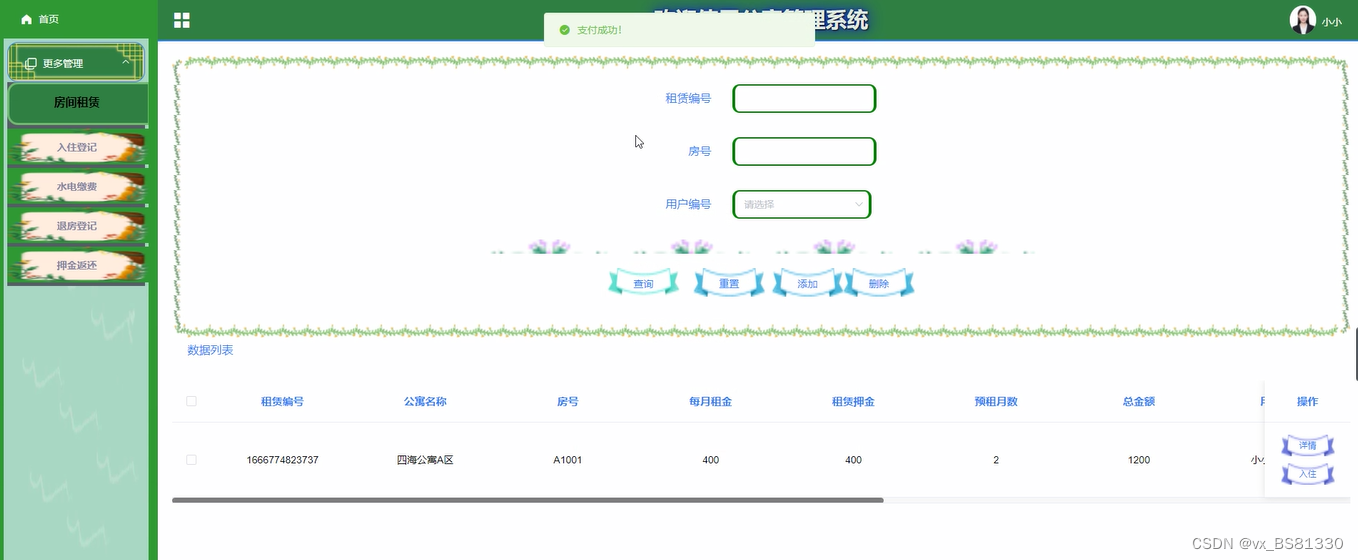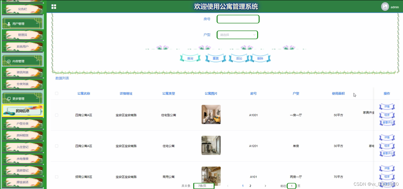 The use of this system can realize the informatization of the apartment management system, and facilitate users to complete the whole process from renting to daily water and electricity payment, check-out and rent refund in one system, which is convenient, time-saving and labor-saving. The administrator also conducts more convenient and efficient management, which can improve the management efficiency of apartment management.