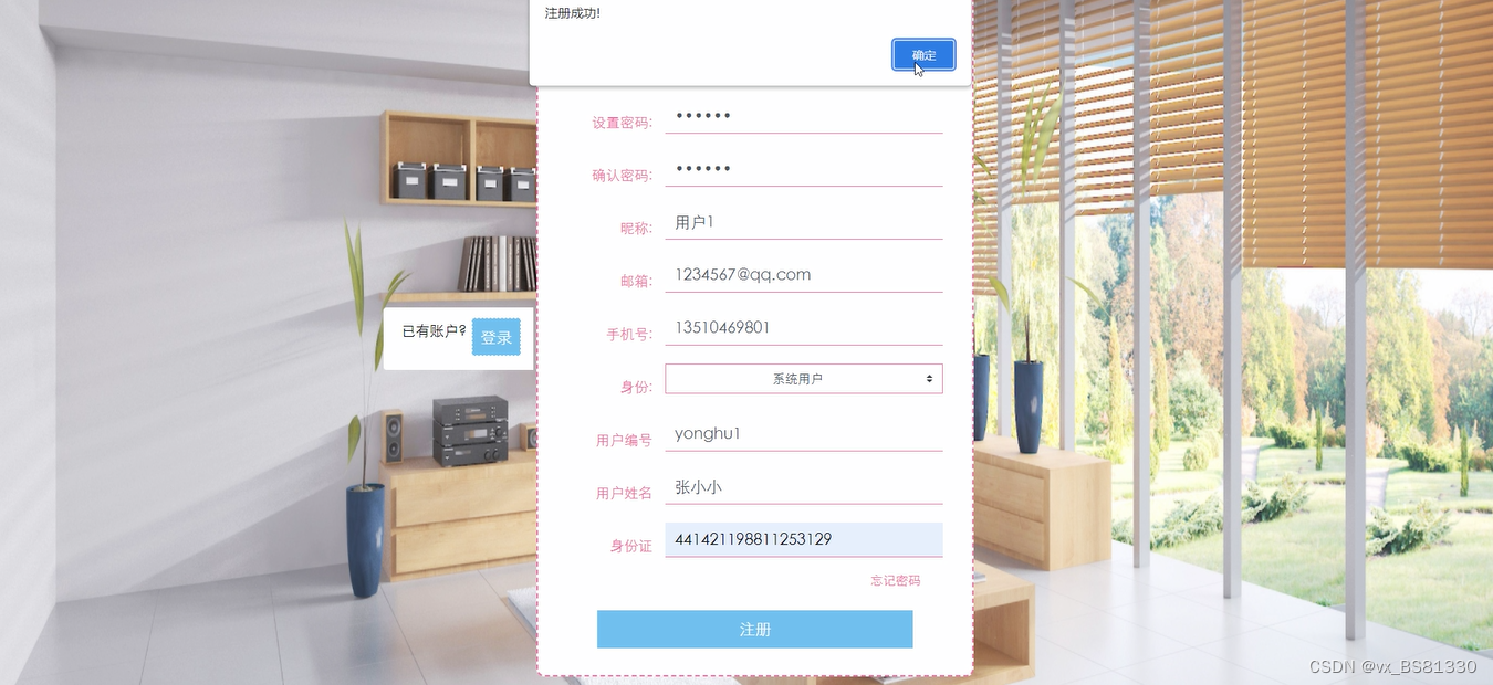 用户在填写数据的时候必须与注册页面上的验证相匹配否则会注册失败,注册页面的表单验证是通过JavaScript进行验证的,用户名的长度必须在5到16之间,邮箱必须带有@符号,密码和密码确认必须相同,你输入的密码,系统会根据你输入密码的强度给出指定的值,电话号码和身份证号码必须要求输入格式与系统要求相符合,当你前台验证通过的时候你点击注册,表单会将你输入的值通过name值传递给后台并保存到数据库中。