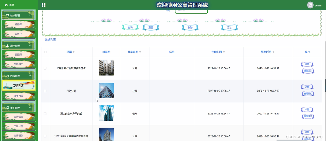 管理员点击菜单“内容管理”,页面跳转到内容管理外观,调用后台公寓资讯查询所有的公寓资讯和房间信息。并将信息密封到数据集合List,绑定到请求对象,然后页面跳转到相应的Python页面,显示出相关资讯,单击删除按钮完成资讯的删除。