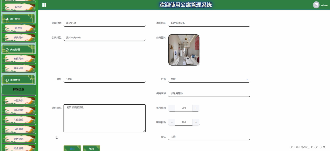 更多管理:对房间信息、户型分类进行增删改操作、完成租赁后的入住登记、发布水电缴费通知、退房登记、返还押金等操作。