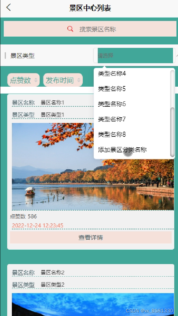 景区中心,在此页面可以根据类型,名称等方式查询景区信息,并对景区进行点赞,评论,收藏或者门票购票等操作,如图4-5,4-6所示。