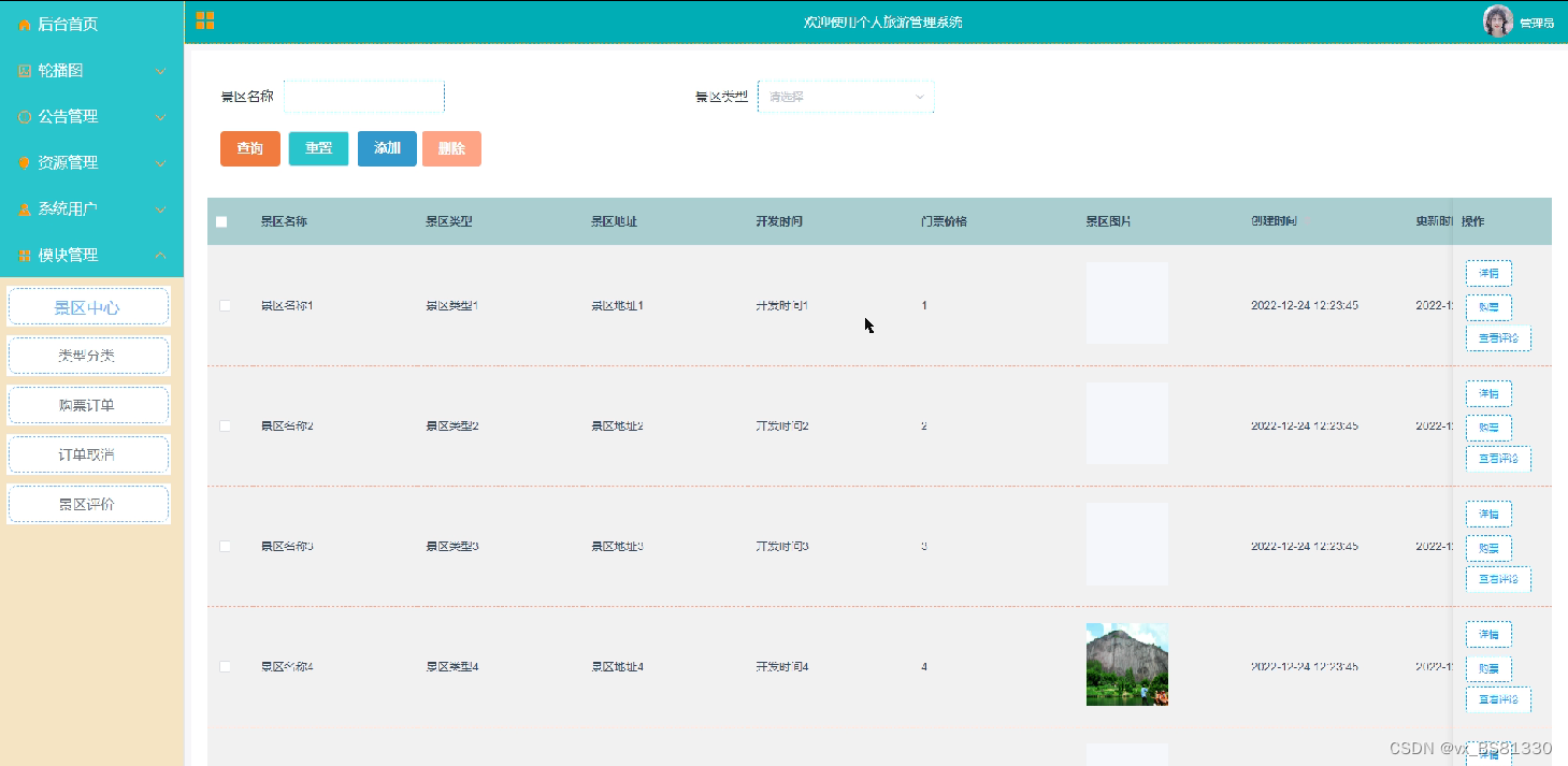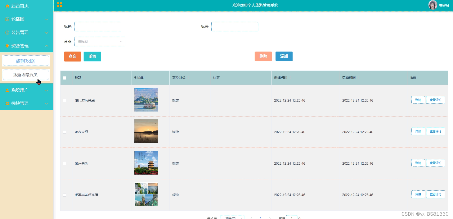 资源管理,在此页面可以对旅游攻略进行查询,重置,添加,删除等操作,如图4-9所示。