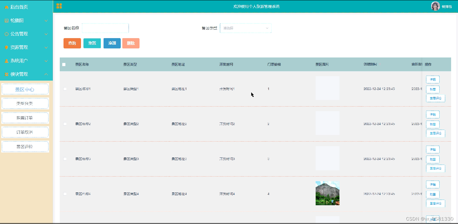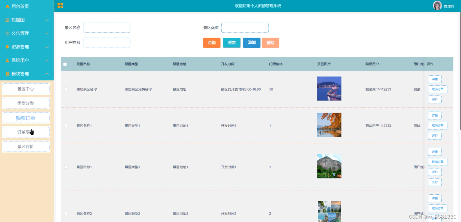2. 系统功能还不够完善,无法提供丰富多彩的在线功能,只能实现管理员:后台首页(购票订单统计),轮播图管理,公告管理,资源管理(旅游攻略,旅游攻略分类),系统用户(管理员,普通用户),模块管理(景区中心,类型分类,购票订单,订单取消,景区评价)等功能。