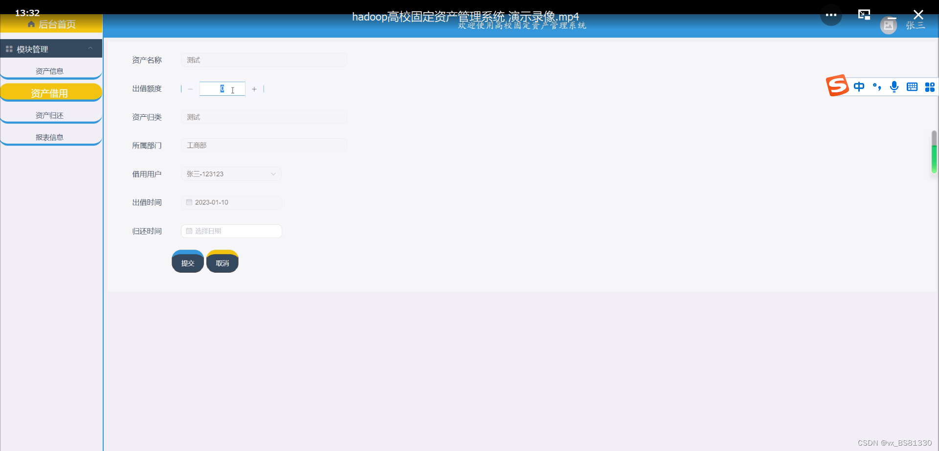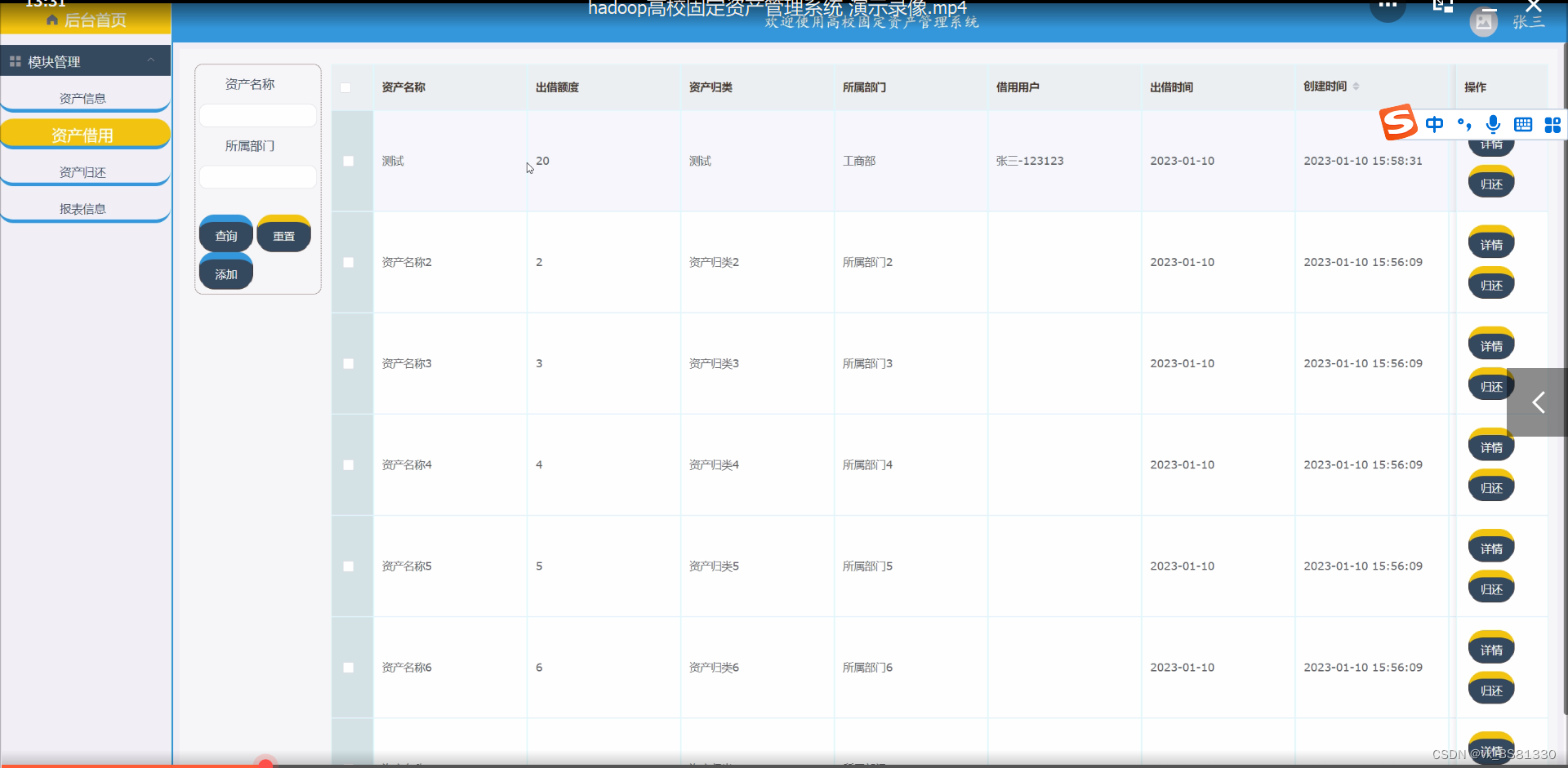 用户在资产借用管理页面中可以添加借用信息:资产名称、出借额度、资产归类、所属部门、借用用户、出借时间、归还时间等内容,在资产借用管理界面列表可以对已有的资产借用信息进行添加资产借用或详细等操作,如下所示。