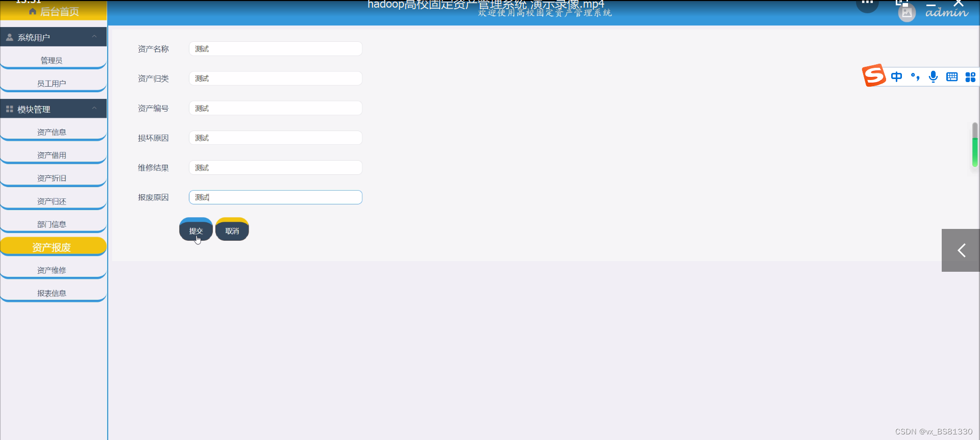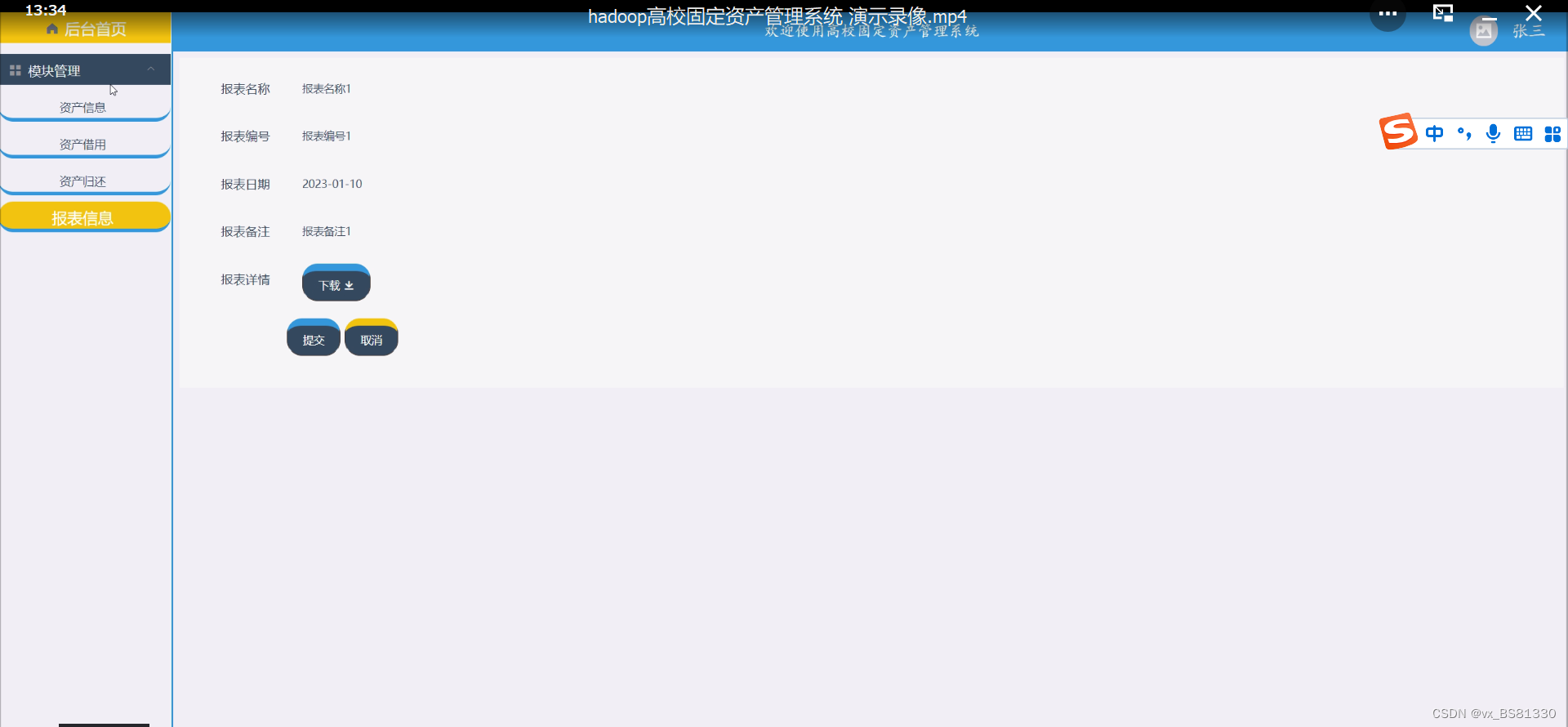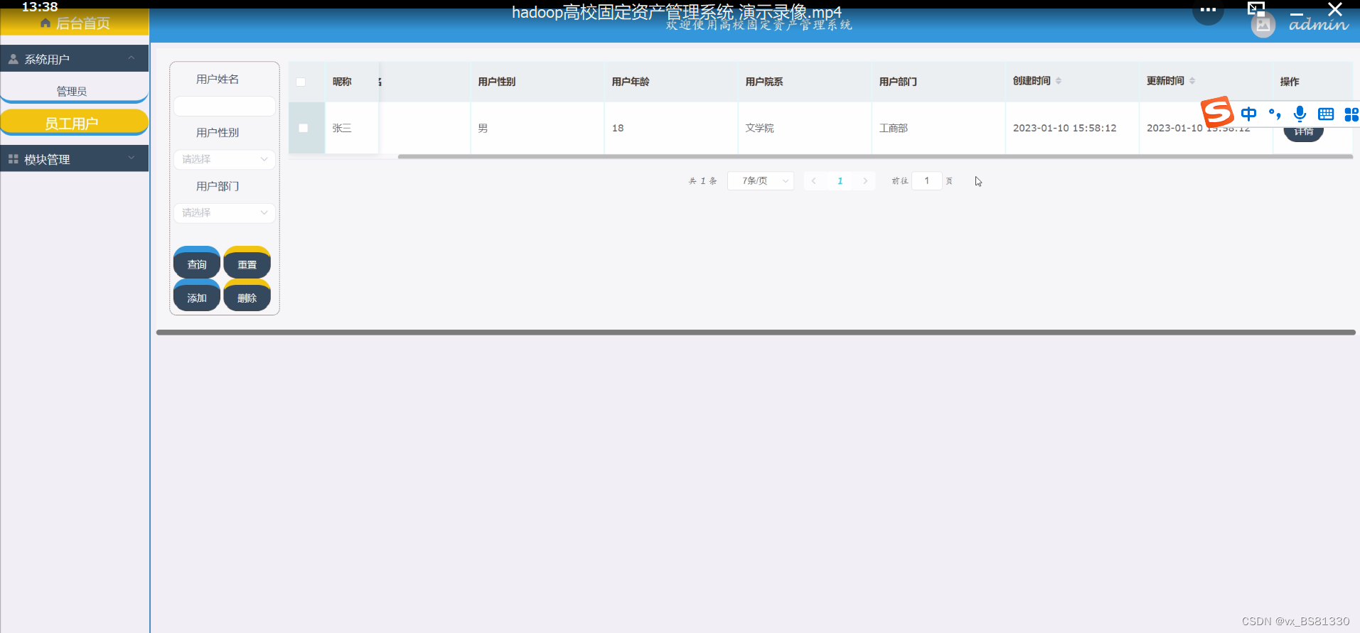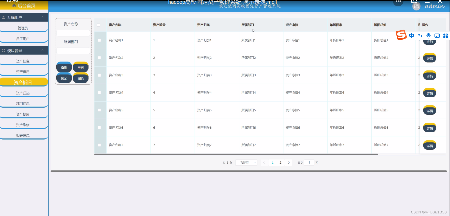 管理员登录系统后台可以查询功能:首页、系统用户(管理员、员工用户)模块管理(资产信息、资产借用、资产折旧、资产归还、部门信息、资产报废、资产维修、报表信息)等功能,如下图所示。