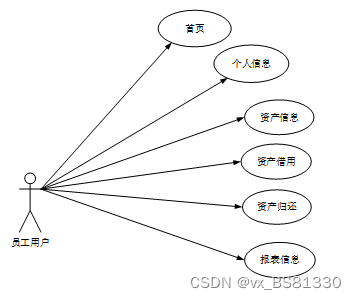 1.系统用户主要使用系统的首页、个人信息、资产信息、资产借用、资产归还、报表信息,下图所示为系统用户的用例图。