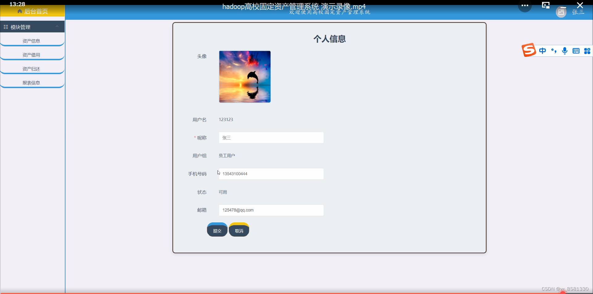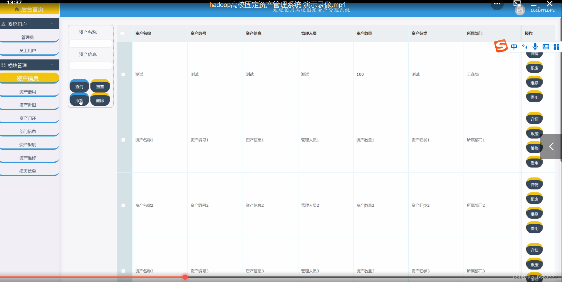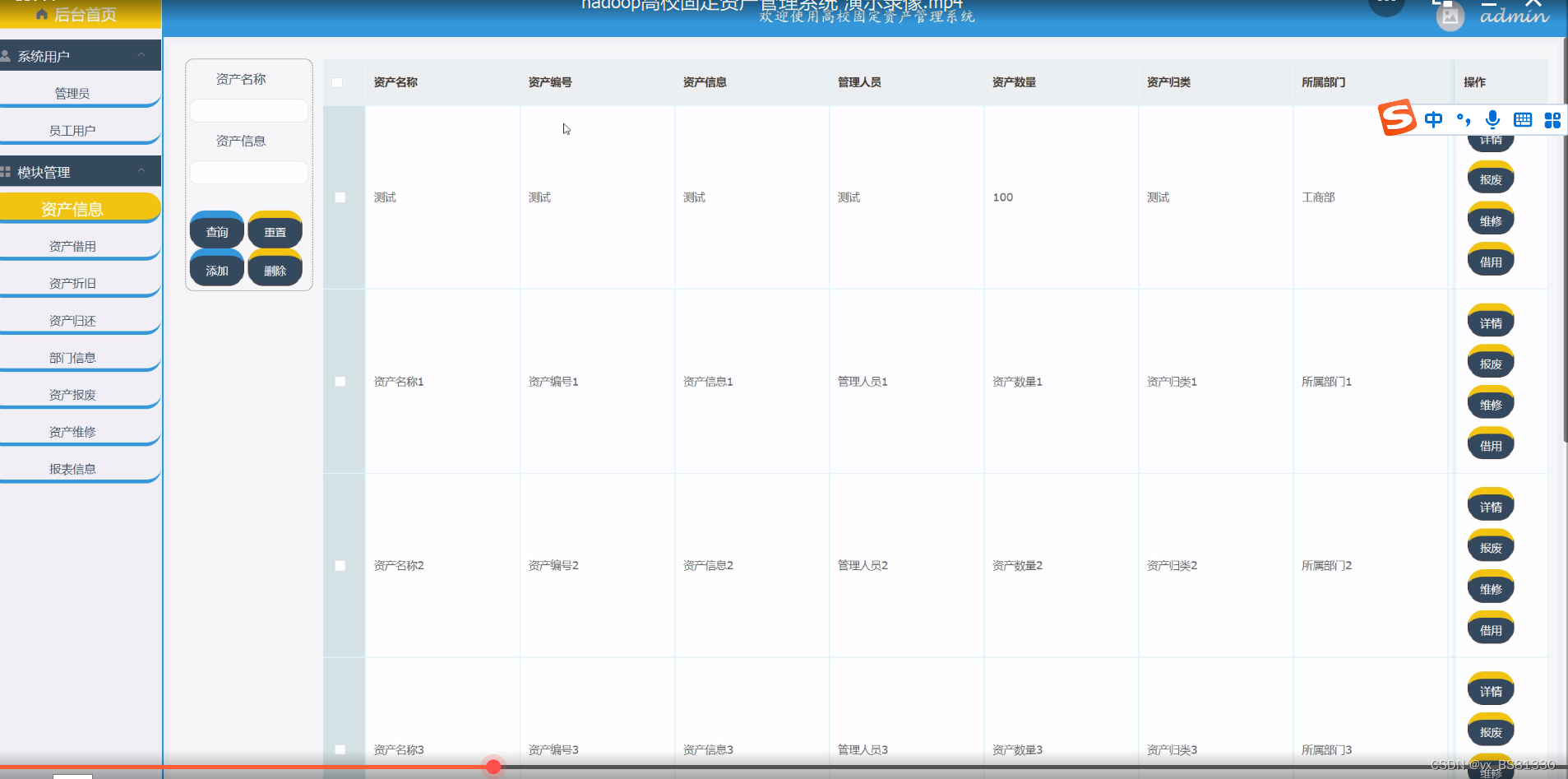 系统界面简洁大方,布局合理,易操作易上手。对应用户的每一步操作,系统都能高响应地做出反馈。系统功能具体包含对系统首页、系统用户(管理员、员工用户)模块管理(资产信息、资产借用、资产折旧、资产归还、部门信息、资产报废、资产维修、报表信息)等功能,为提供一个管理平台,实现对数据地高效、安全地管理。