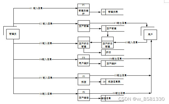 高校固定资产管理系统底层数据流图主要描述系统底层模块的数据流、数据载体、数据处理、外部实体的具体交互。本系统就是管理员和用户在产信息、资产借用、资产折旧、资产归还、部门信息、资产报废、资产维修、报表信息、等模块上的数据交互。