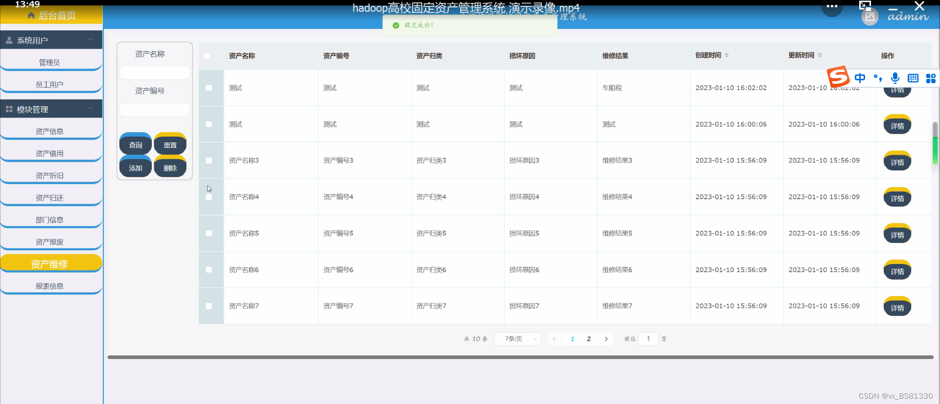管理员在资产维修管理页面可查询资产维修信息:、资产编号、资产名称、资产归类、损坏原因、维修结果等内容,还可在该页面进行修改删除详细等操作,资产维修管理界面图如下: