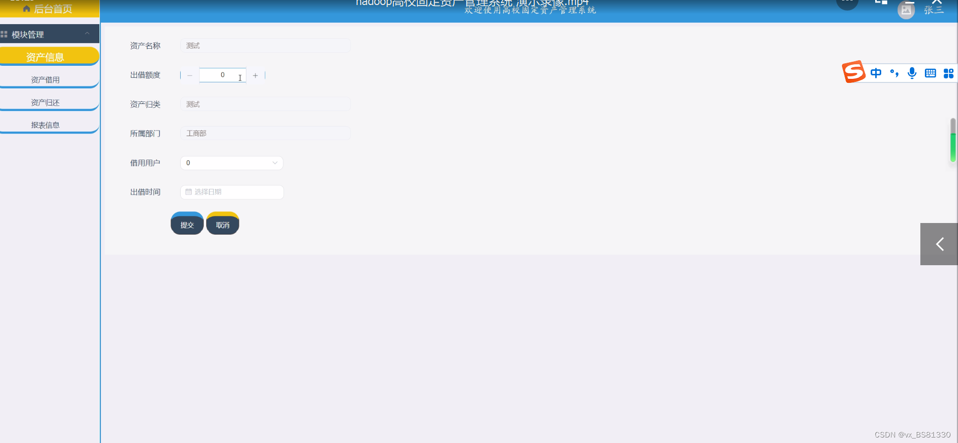 在资产管理页面资产列表中可以查看资产信息、资产名称、出借额度、资产归类、所属部门、借用用户、出借时间等内容,还可在该页面进行提交和详细操作,如下图5-3所示