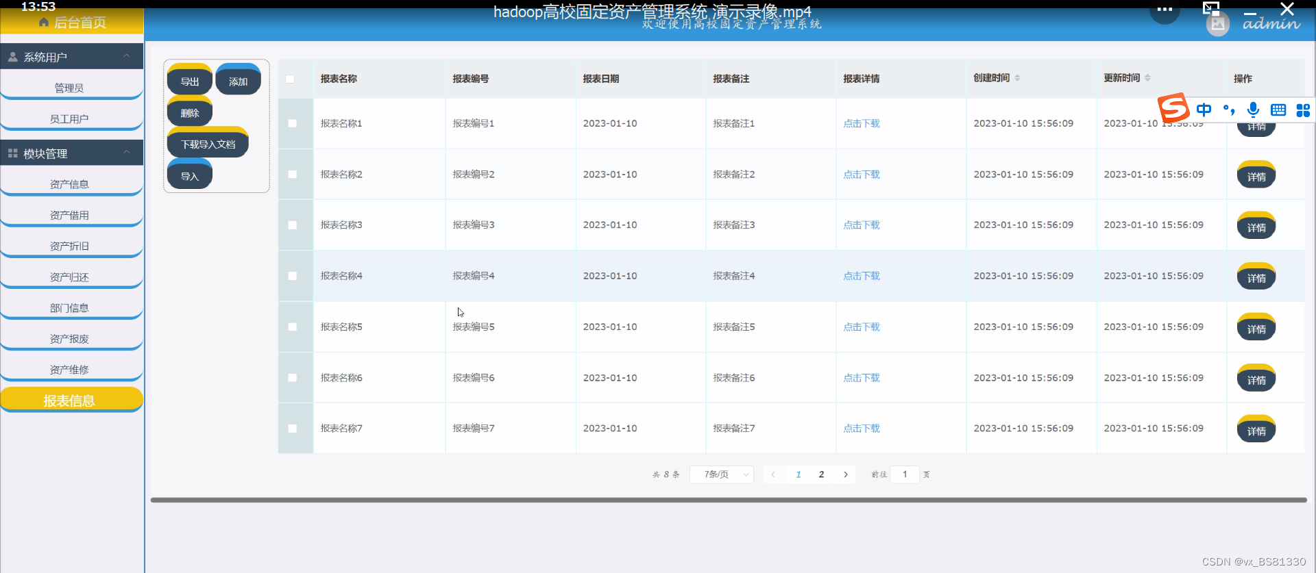 管理员在报表信息管理页面可查询报表信息:报表名称、报表编号、报表日期、报表备注、报表详情下载等信息,还可在该页面进行修改删除详细等操作,如下图所示