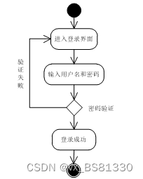 用户可进行登录使用更多功能,首先进入用户登录界面,输入用户账号和密码,后台对账号和密码信息进行核对验证,验证成功则页面直接显示登录用户昵称代表登录成功,否则返回用户登录界面。用户登录活动图如下图。