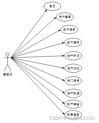 2.管理员主要负责首页、系统用户(管理员、员工用户)模块管理(资产信息、资产借用、资产折旧、资产归还、部门信息、资产报废、资产维修、报表信息),下图所示描述管理员的用例图。