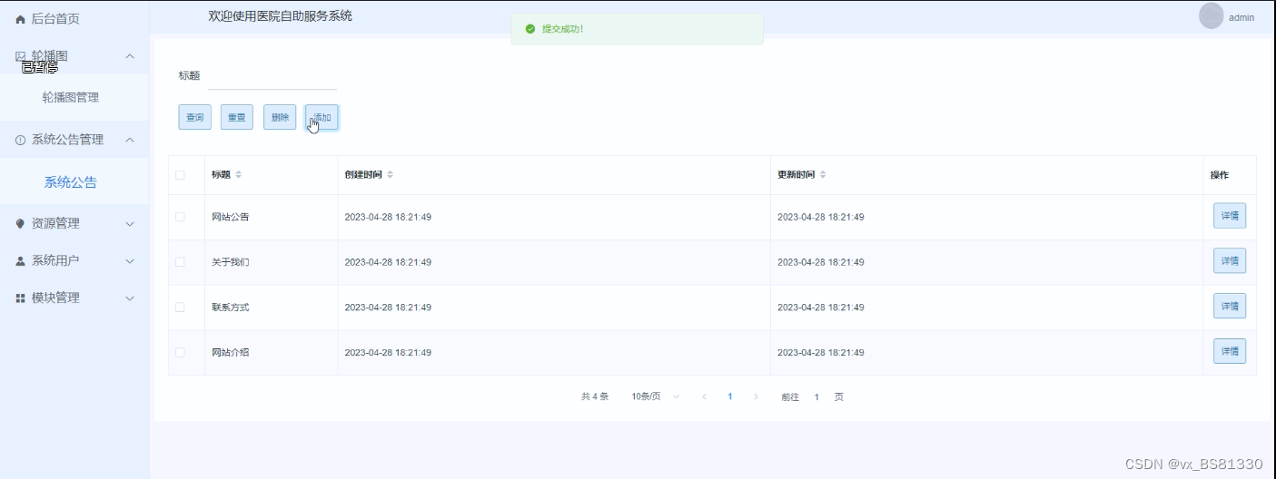 (2)轮播图:管理员点击“轮播图”菜单可以对首页展示的轮播图进行增删改查。