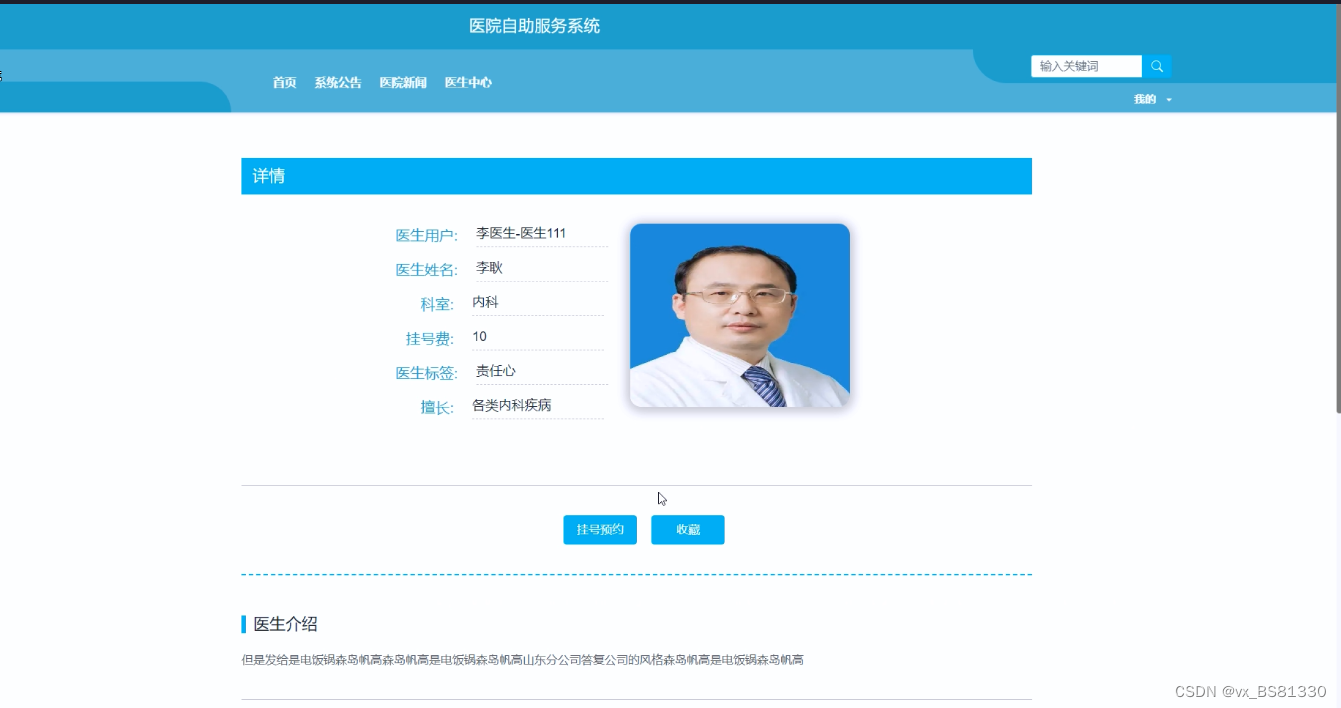 (4)医生中心:当用户点击“医生中心”这一菜单按钮,会显示管理员在后台发布的所有的医生中心,支持通过关键词对医生中心进行搜索,选择需要的医生中心点击可以进入到医生中心详细的介绍界面,在详细界面可以查看到医生的医生用户、医生姓名、科室、挂号费、医生标签、擅长等信息,同时可以进行挂号预约、收藏、评论操作;