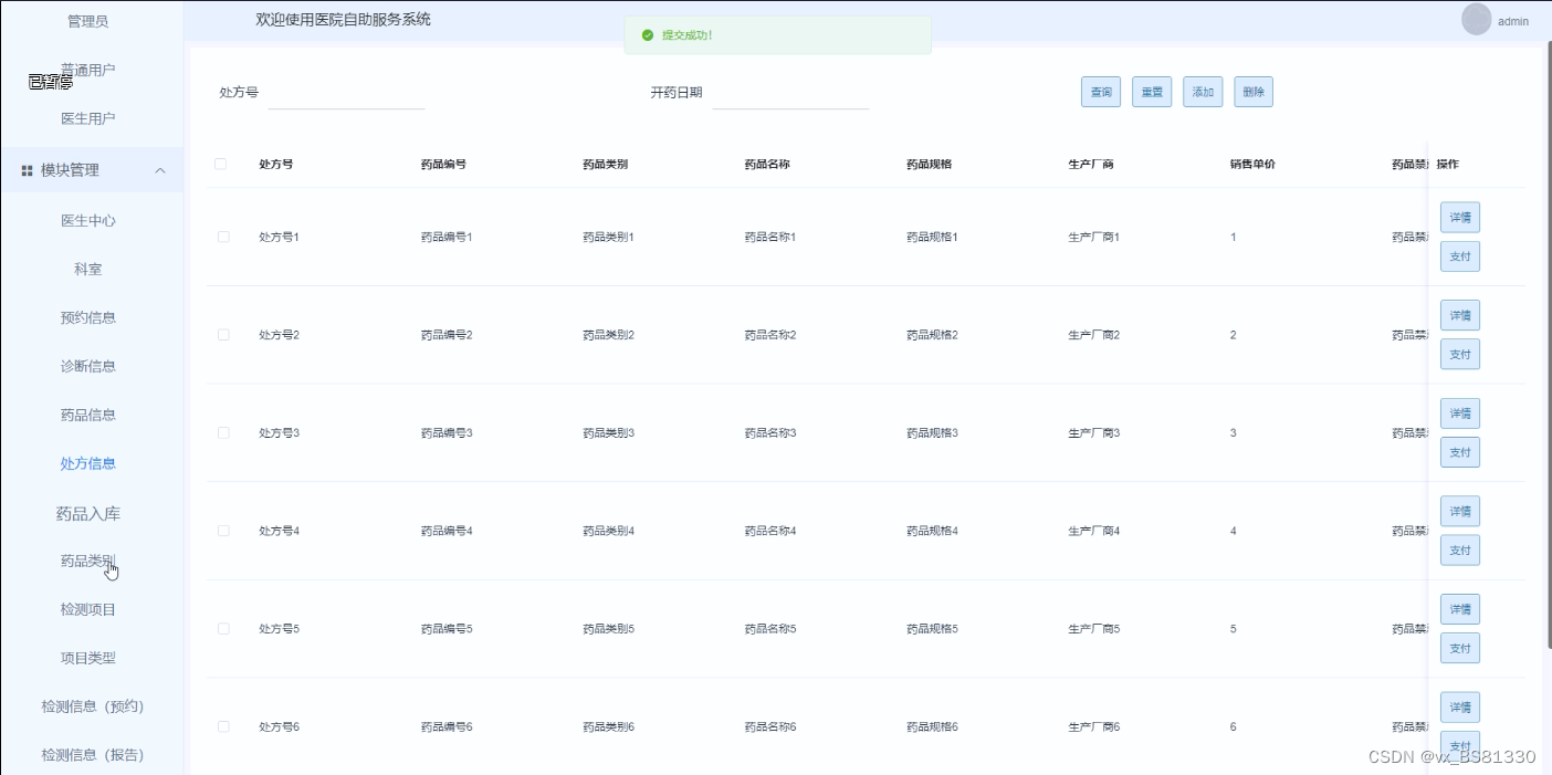 管理员点击“处方信息”会显示出所有的处方信息,支持输入处方号或者药品编号对处方信息进行查询,如果想要添加新的处方信息,点击“添加”按钮,输入相关信息,点击“提交”按钮就可以添加了,同时可以选择某一条处方信息,点击“删除”进行删除,也可以点击后面的“支付”按钮对处方信息的支付信息进行设置。界面如下图4-12所示。