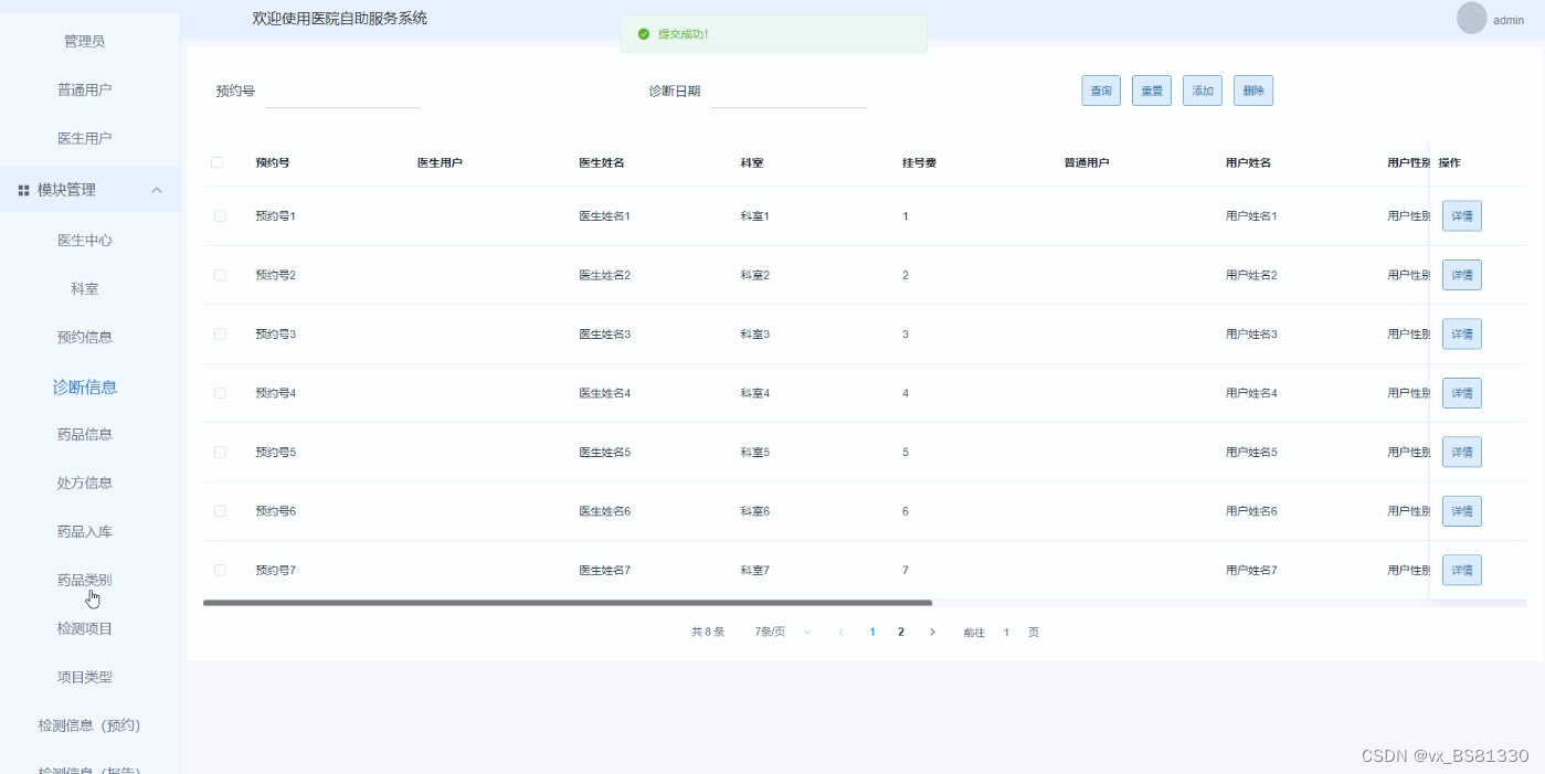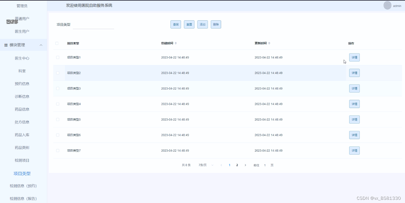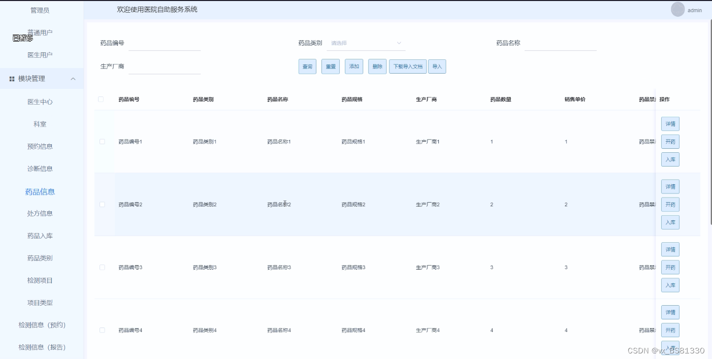 (5)模块管理:在“模块管理”这一菜单下,我们会看到医生中心、科室、预约信息、诊断信息、药品信息、处方信息、药品入库、药品类别、检测项目、项目类型、检测信息(预约)检测信息(报告),管理员可以对其进行增删改查操作。