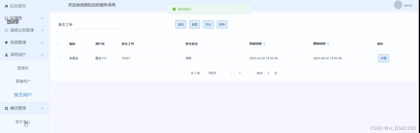 (4)系统用户:管理员点击“系统用户”菜单可以对系统中存在的用户进行管理,包含了管理员用户、医生用户和普通用户。