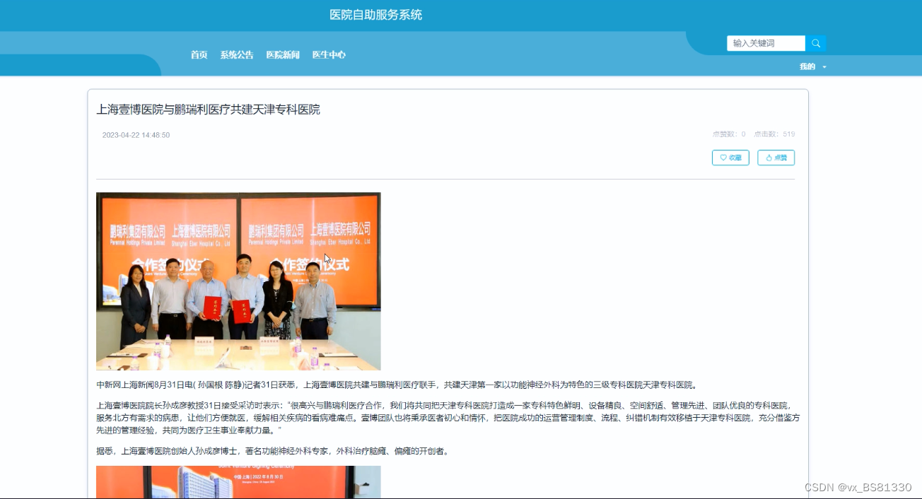 (3)医院新闻:用户进行资讯的阅览,查看管理者发布的医院新闻信息。