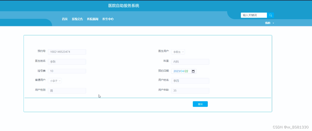(5)挂号预约:当用户在医生中心详情界面想要进行挂号预约,点击下方的“挂号预约”按钮,就会跳转到挂号预约信息填写界面,根据界面提示输入挂号预约信息,点击“提交”按钮,挂号预约就完成了;