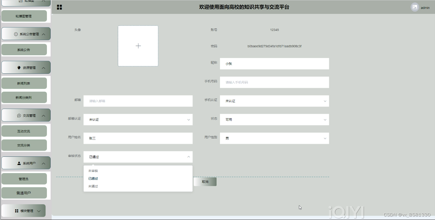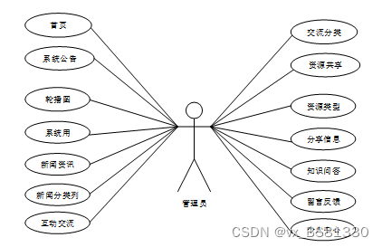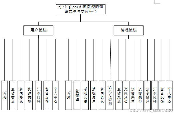 基于面向高校的知识共享与交流平台的设计基于现有的手机,可以实现管理员:首页、轮播图(轮播图管理)、系统公告管理(系统公告)、资源管理(新闻列表、新闻分类列)、交流管理(互动交流、交流分类)、系统用户(管理员、普通用户)、模块管理(资源共享、资源类型、分享信息、知识问答、留言反馈)、个人中心等详细的了解及统计分析。根据系统功能需求建立的模块关系图如下图: