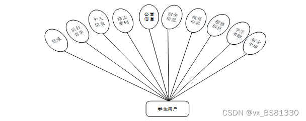 (2)学生用户:后台首页、模块管理(模块管理(公告信息、宿舍信息、寝室信息、报修信息、学生考勤、宿舍申请)个人信息等功能。学生用例如图3-2所示。