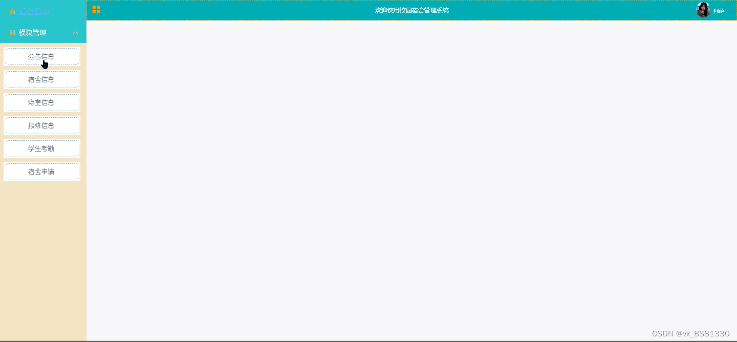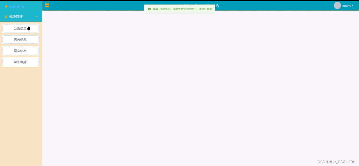 教师用户进入系统可查看管理功能分为后台首页、模块管理(公告信息、宿舍信息、寝室信息、学生考勤)个人信息等功能。如图5-7所示。