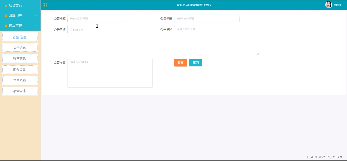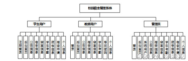 本校园宿舍管理系统主要包括四大功能模块,即管理员、学生用户、维修用户、教师用户用户模块。