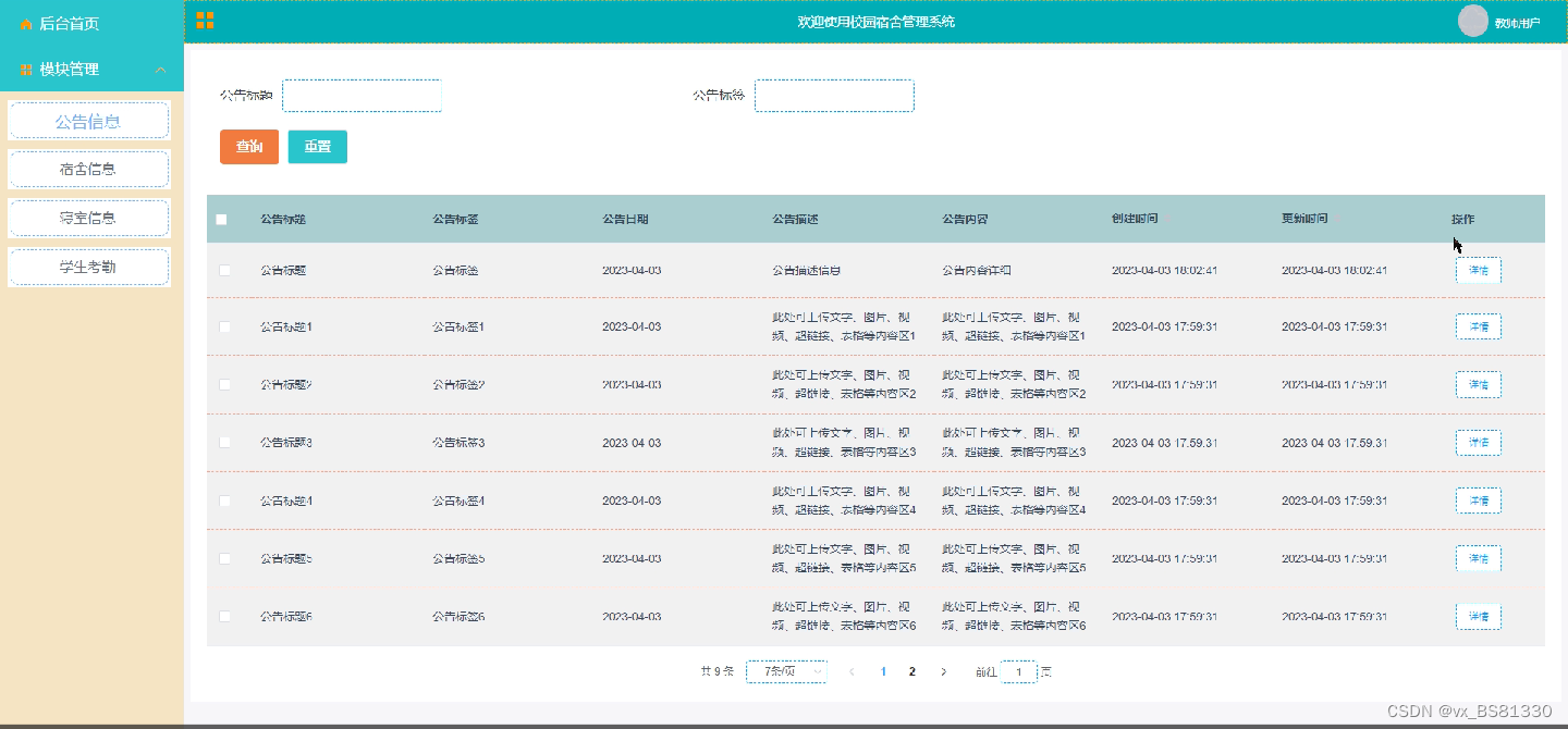 公告信息,教师用户员可在公告信息页面查看公告标签、公告标题、公告内容、公告日期等详细,如图5-8所示。