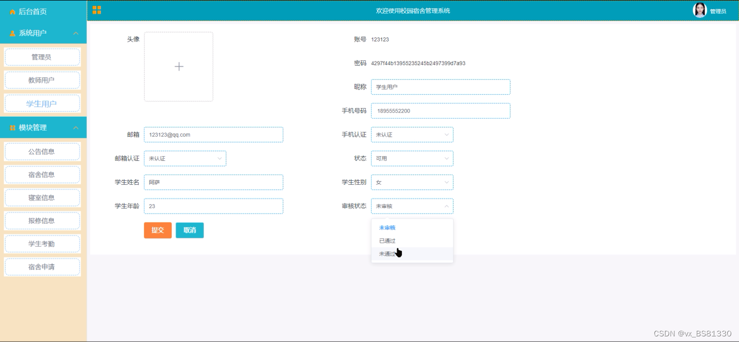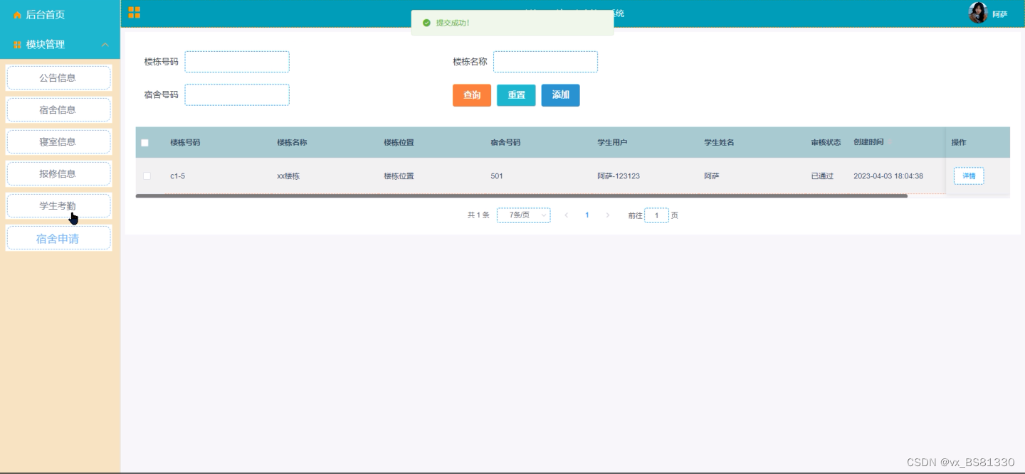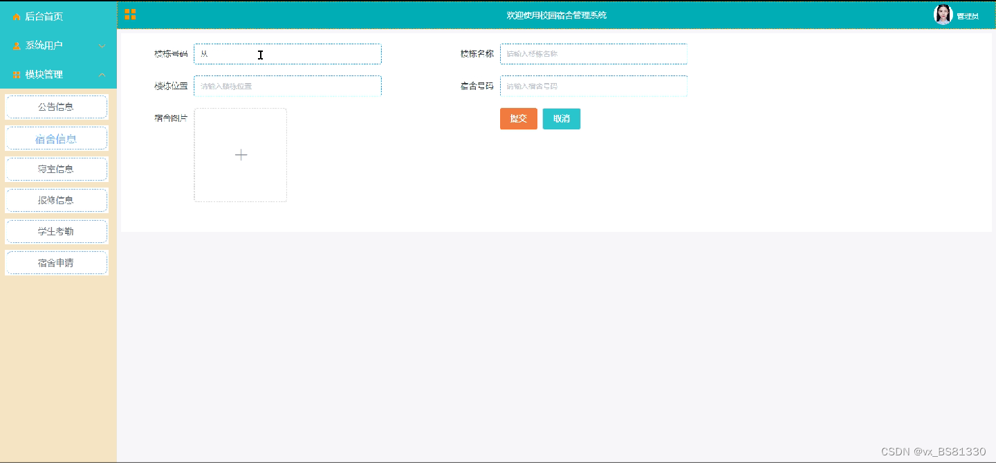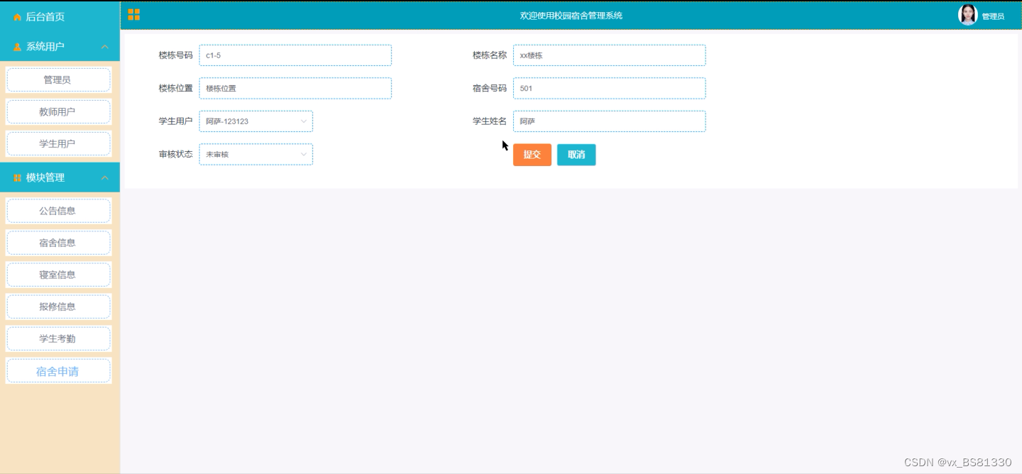 宿舍申请,在宿舍申请页面中可以编辑楼栋号码、楼栋名称、楼栋位置、宿舍号码、学生用户、学生姓名等详细信息进行提交宿舍申请,由管理员进行审核,如图5-15 5-16所示。