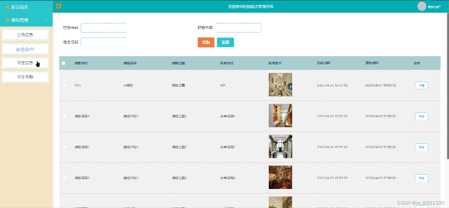 寝室信息,教师用户可在在宿舍信息查看楼栋名称、楼栋号码、楼栋位置、宿舍号码、学生用户、学生姓名等详细信息,如图5-10所示。