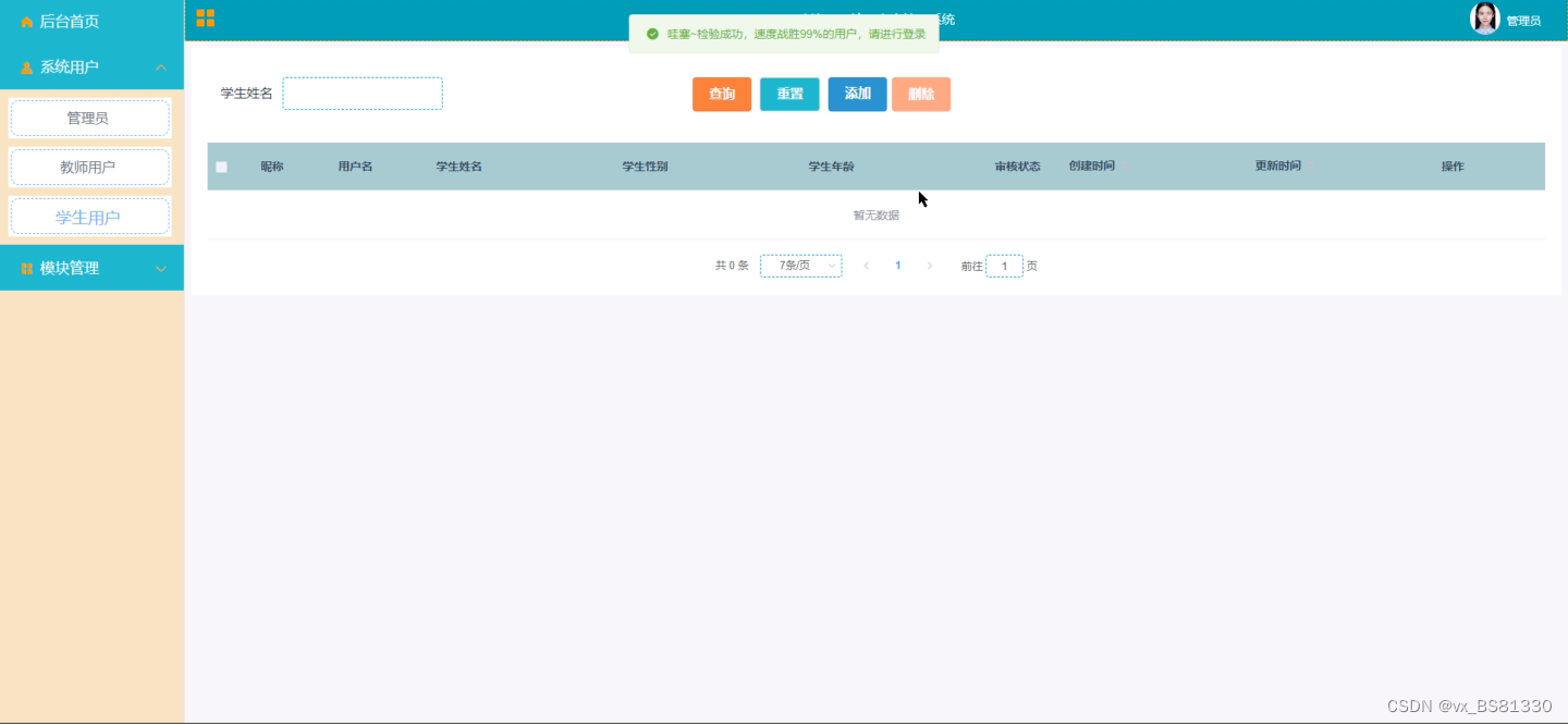 系统用户,在系统用户管理页面中可以添加昵称、用户名、学生姓名、学生年龄、学生性别等信息,还可以根据需要在学生列表查询进行修改或删除等详细操作,如图5-3 5-4所示。